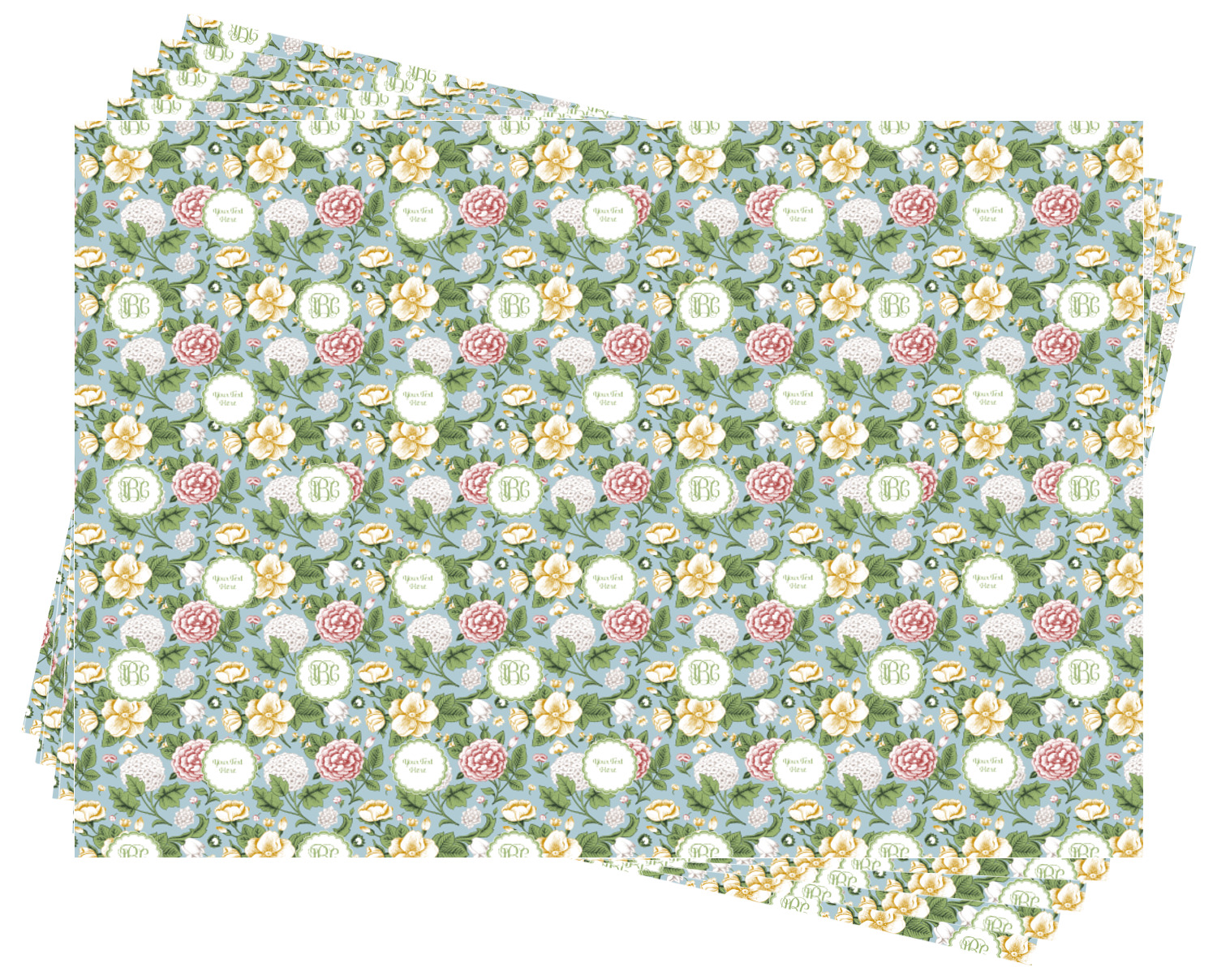 The vintage flowers in this design are cream colored magnolias, surrounded by olive green leaves on a demure blue background. The design has a classic ribbon in olive green trimmed in white. The decorative scalloped label is in white and is the perfect place for your monogram for that personal touch to pull the entire design together.