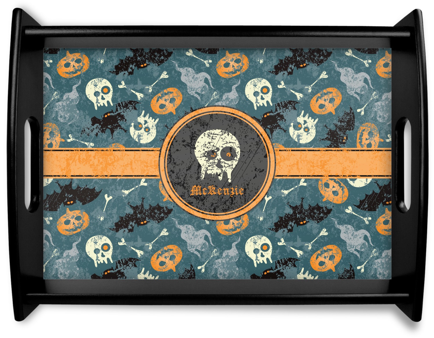 This serving tray with handles features square edges and two rounded sides, creating a very modern look. Each side is fabricated from a beautifully cut, natural wood. The bottom of the interior of the tray displays your customized design in bright, vibrant color. The tray is sold in both a black color and a natural wood look. Each variation of the wood serving tray has two sizes: Small, which is 14" x 10" x 2.25", and Large, which is 19.5" x 13.5" x 2.75".