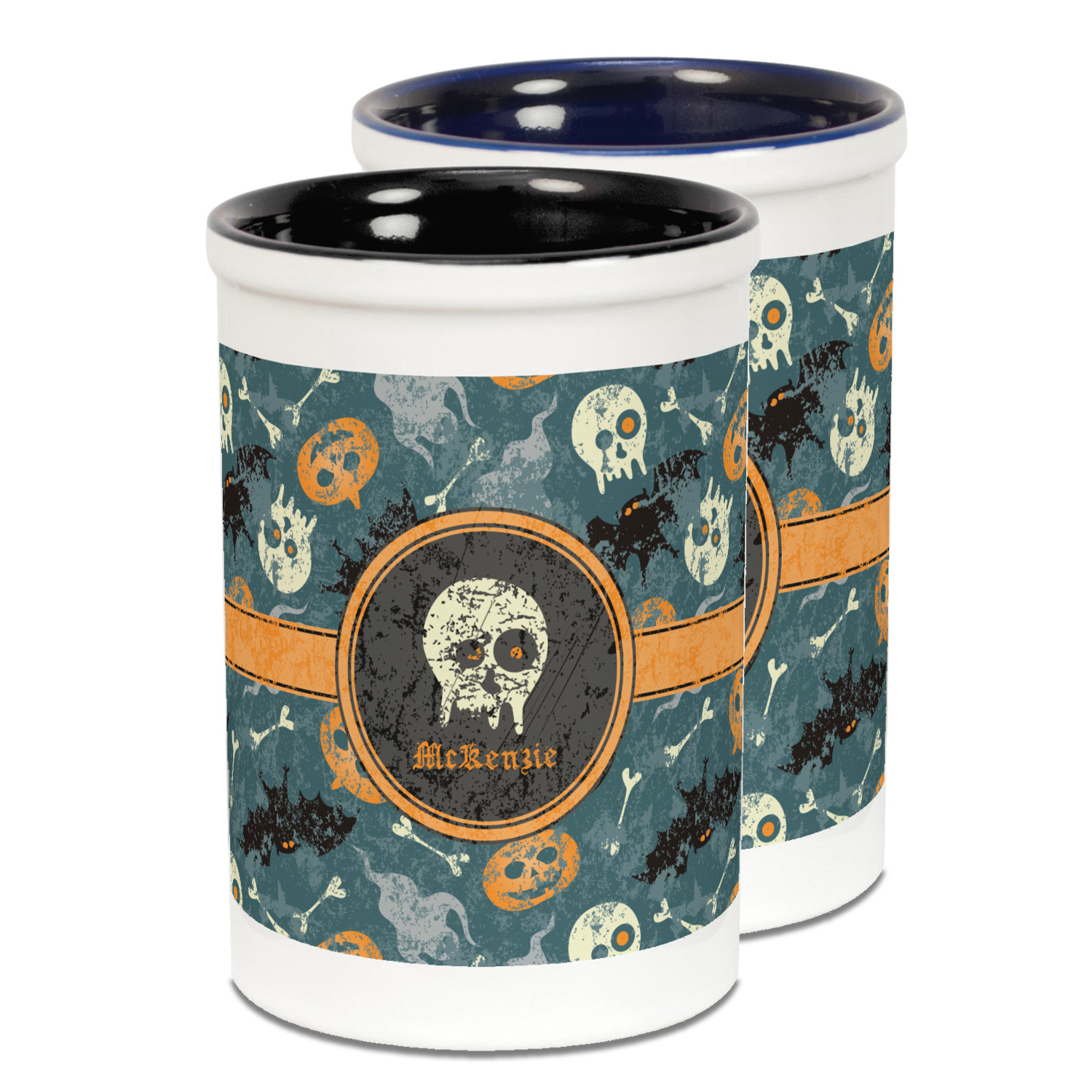 Both the blue and black pencil holders are a ceramic material, giving you a sturdy and long-lasting pen and pencil holder. We print your designs on the exterior of the pencil cup, covering most of the outside surface. There is a small white border on the top and bottom of the exterior of the pen holder, setting apart your design from the interior's color. Our ceramic pen caddy is roughly 3.5" x 3.5" x 5" in dimensions.