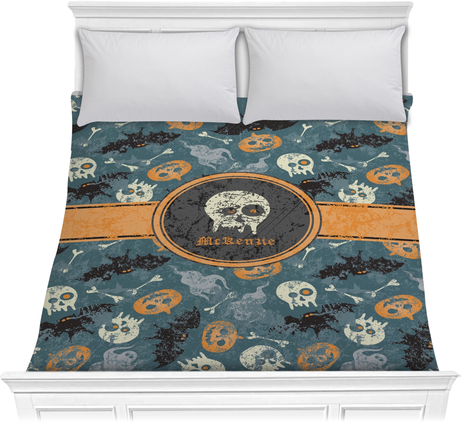 Halloween: the one day a year when it's totally normal to see human bones and skulls everywhere. This design brings together all your favorite (and usually quite terrifying) things from October 31st on a deep vintage blue background.
