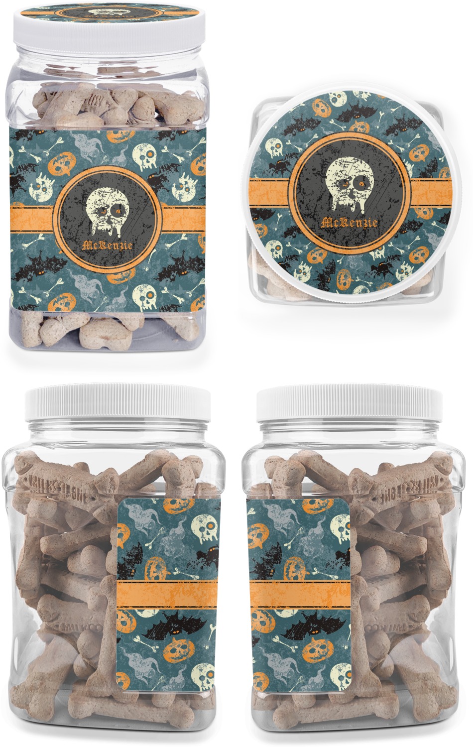 This half gallon jar, made from a sturdy plastic, is the perfect way to keep treats from any naughty pet paws, while still keeping them ready on hand for when your pup performs an impressive trick. This dog cookie jar features a screw-on, white lid that displays your personalized design on a vinyl sticker. We apply another customized sticker that wraps around the front and sides of the jar. Our dog treat jar also has indentations on the rear ends of the sides, which allows for convenient handling, and its square frame allows for easy storage.