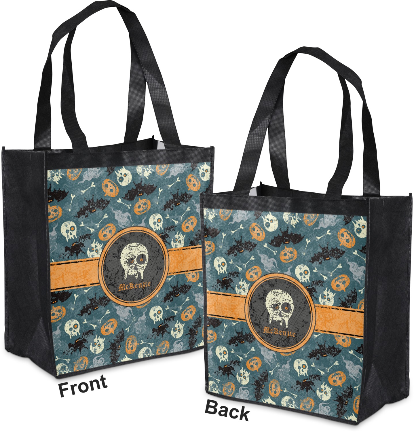 Made from a durable, biodegradable material, these reusable shopping bags can support up to 30 pounds of weight. With two large handles, measuring at 8.5 inches each, these personalized tote bags are easy to carry to your vehicle or home. The bag itself is 12 by 13.5 inches, and can expand to a depth of 7 inches. Your customization is printed on both the front and back, while the remaining sides, trim, and handle are a sleek, charcoal black.