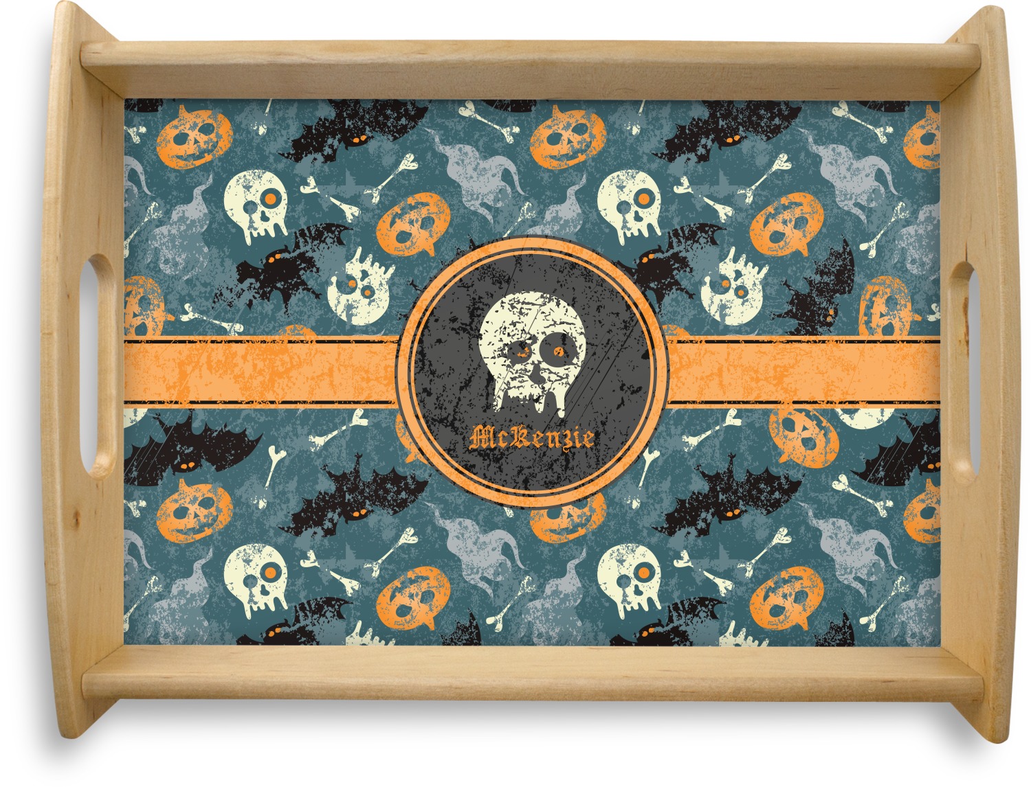 This serving tray with handles features square edges and two rounded sides, creating a very modern look. Each side is fabricated from a beautifully cut, natural wood. The bottom of the interior of the tray displays your customized design in bright, vibrant color. The tray is sold in both a black color and a natural wood look. Each variation of the wood serving tray has two sizes: Small, which is 14" x 10" x 2.25", and Large, which is 19.5" x 13.5" x 2.75".