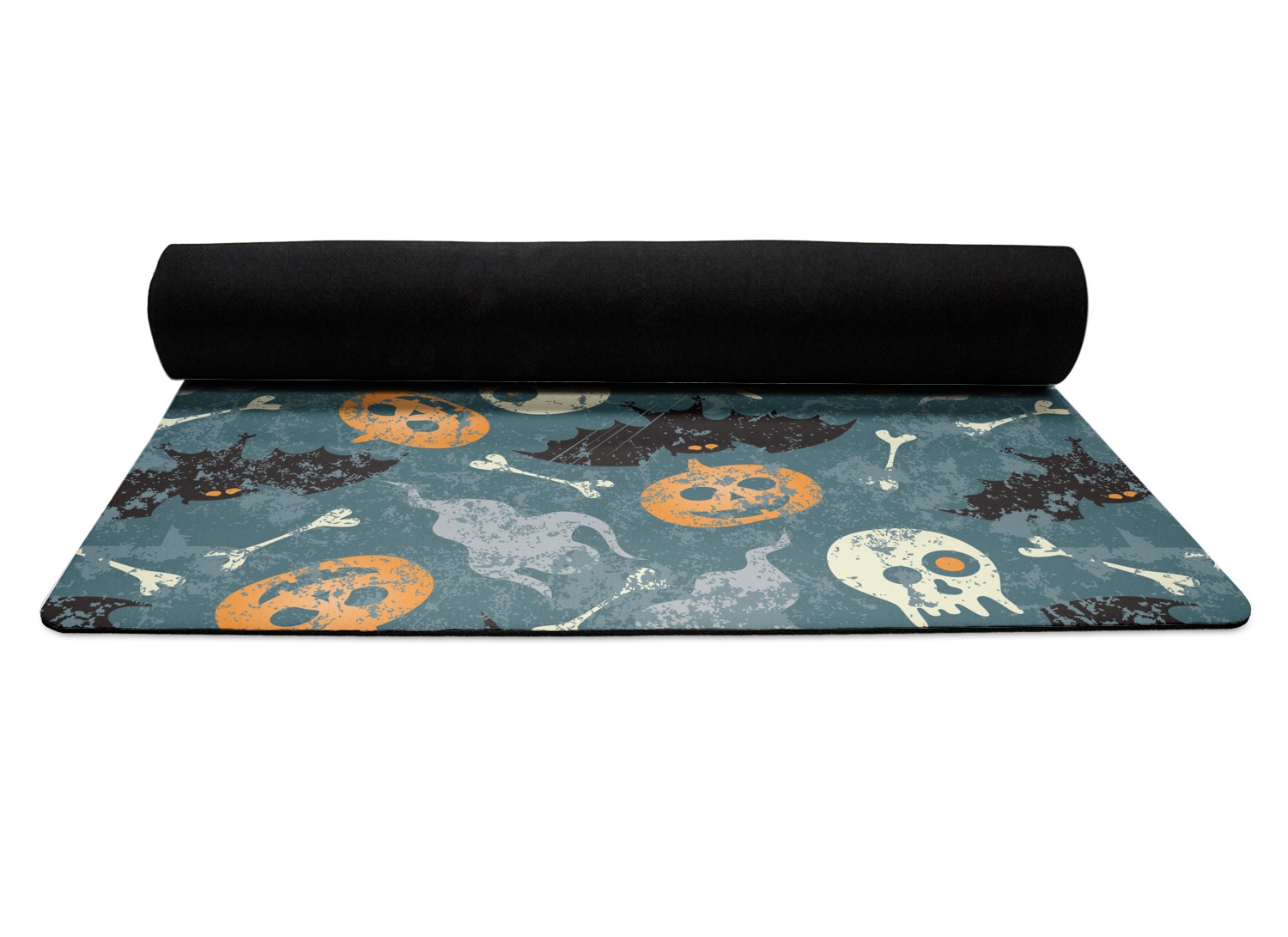 Halloween: the one day a year when it's totally normal to see human bones and skulls everywhere. This design brings together all your favorite (and usually quite terrifying) things from October 31st on a deep vintage blue background.