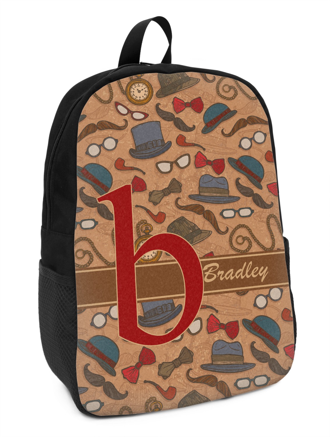 These small backpacks are made of a durable black canvas material with your personalization right on the front. The two shoulder straps are padded and easily adjustable. The bag itself measures at about 11" W x 15" H x 5" D. It's the perfect size for elementary aged kids or adults who want a smaller backpack. On the top of the bag you will find a handle to hang or carry your backpack by as well as a large zipper closure to keep all of your belongings safe inside. On each side of your backpack is a mesh pocket for a small item or water bottle. Inside your backpack you will find a spacious area with a small zipper pocket and a padded laptop slot that will fit up to a 13" laptop (13" being very snug). This is the perfect bag for any student that needs a couple books and their laptop with them at all times. It also works great as a carry on for traveling!