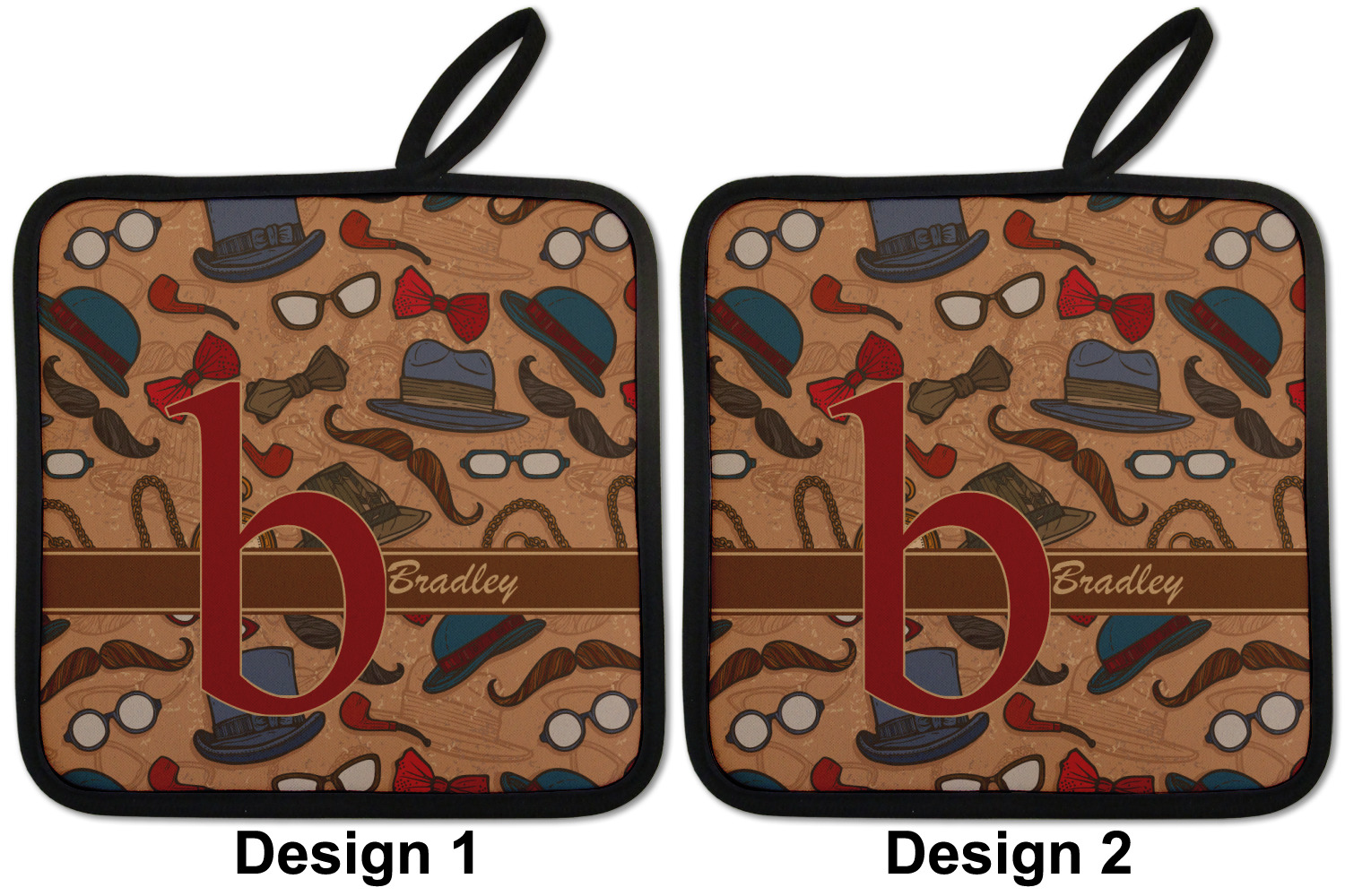 Our personalized pot holders feature a neoprene front that displays your personalization in vibrant colors. The backing of the hot pot holder is rubberized; the textured backing allows you to have a great grip when using this custom pot holder. The two materials are joined with a sleek, black trim, and the holder also includes an attached loop for hanging and storage. The pot holder is approximately 8.75 inches by 8.75 inches and 0.25 inches tall, while the fabric loop is 2.5 inches long. You can purchase a kitchen pot holder by itself or as a set of 2. We also offer a set including one pot holder and one oven mitt.