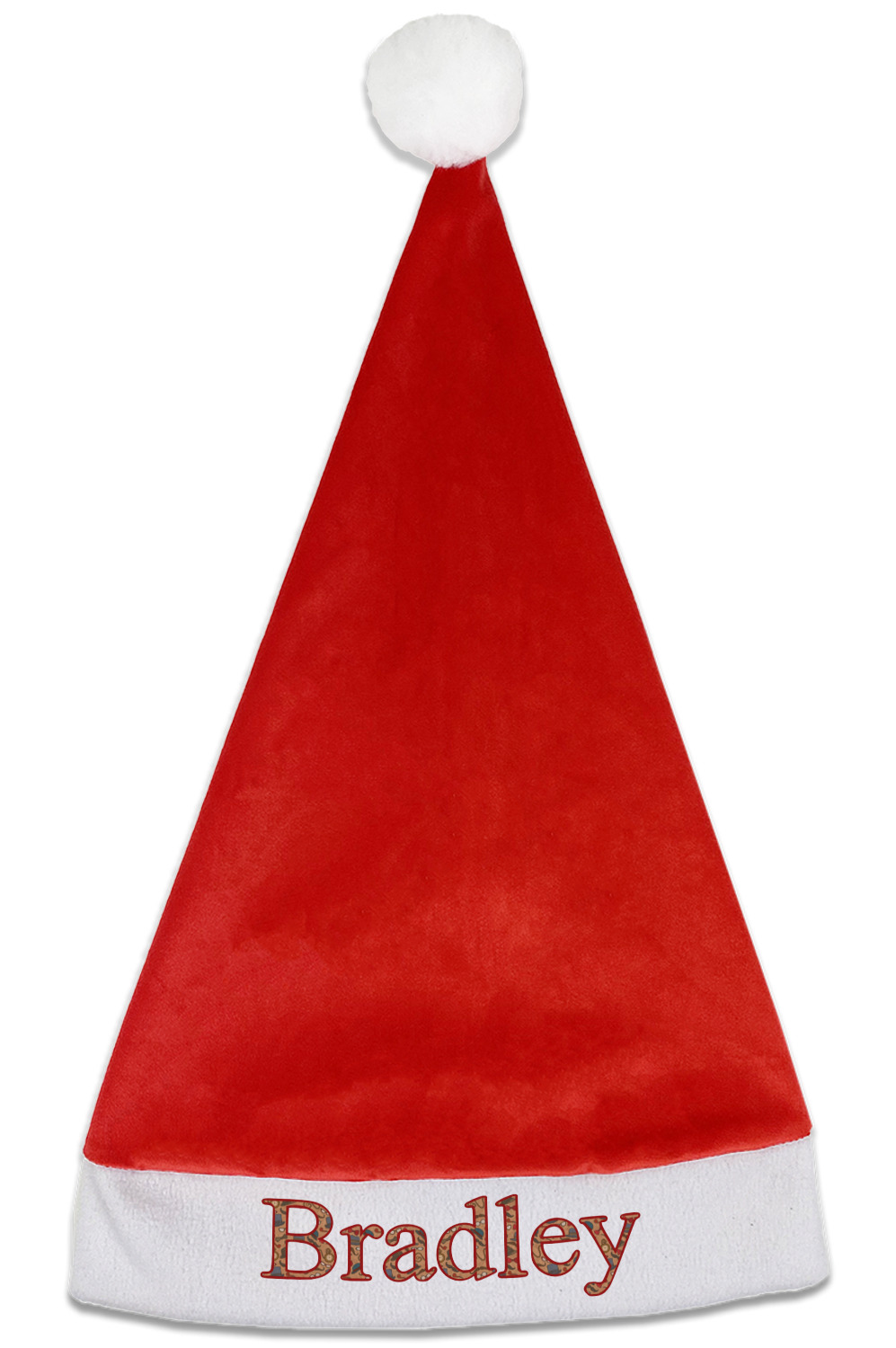 Our Santa hats are a soft, velvety polyester material. These customizable Santa hats are a classic red with white brimming and pom pom ball hanging off the hat tail just like Santa Claus! Each personalized Santa hat is approximately 17.5 L x 11.8 W. We offer two different styles to print your designs on the white brim - front or front & back.