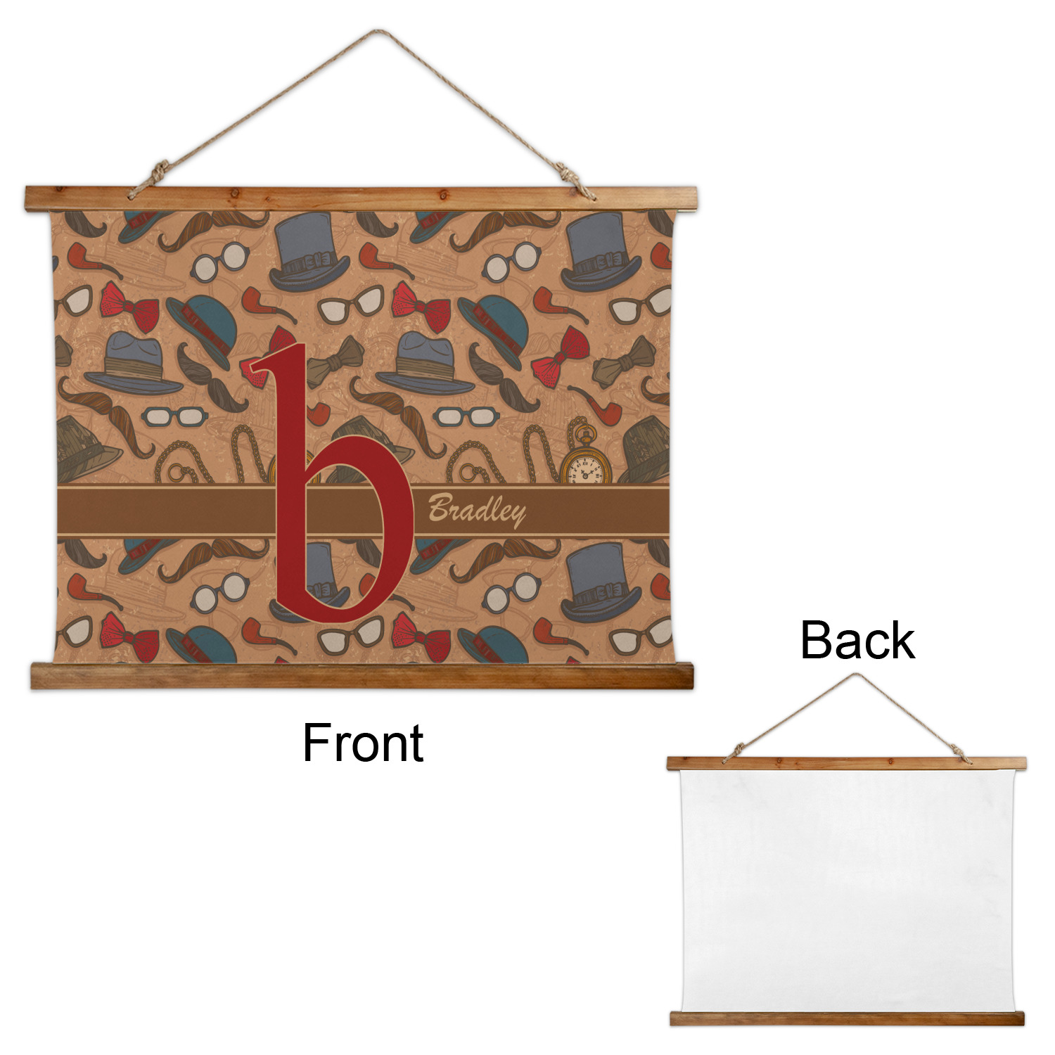 Made in two different orientations - portrait or landscape - both are 26" x 36". Your design is printed on a high quality polyester fabric with hemmed edges. The wood on the top and bottom of the tapestry is 1.25" tall and 0.25" thick and there are two pieces on top and bottom which sandwich the fabric.