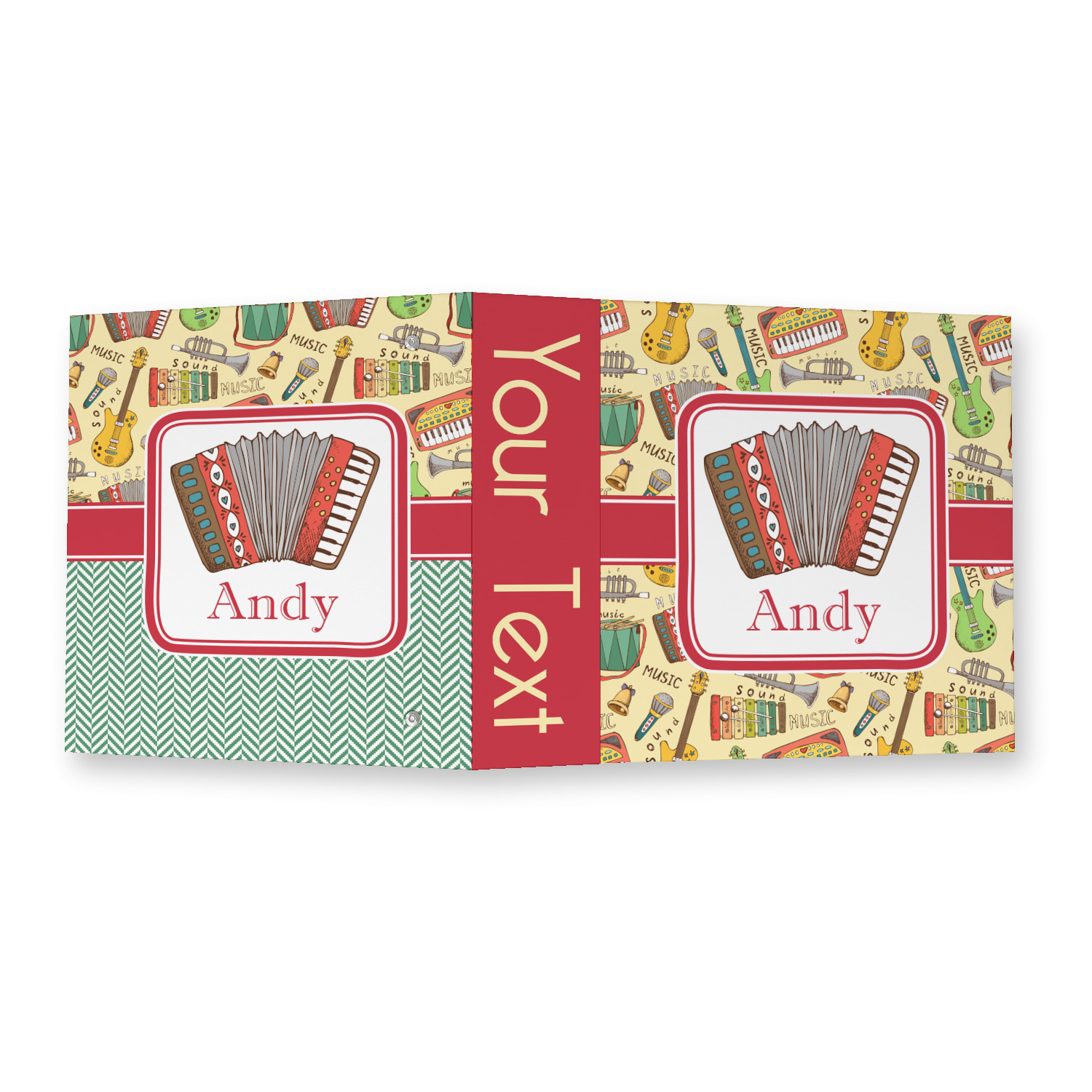 We have selected a classic red ribbon along with a square label that features the accordion along with a name for the personalization. You have a choice of instruments to feature on the label - your choices are: vintage guitar, xylophone, accordion, trumpet, keyboard, drum, microphone or bell and of course you can personalize it with your choice of text.