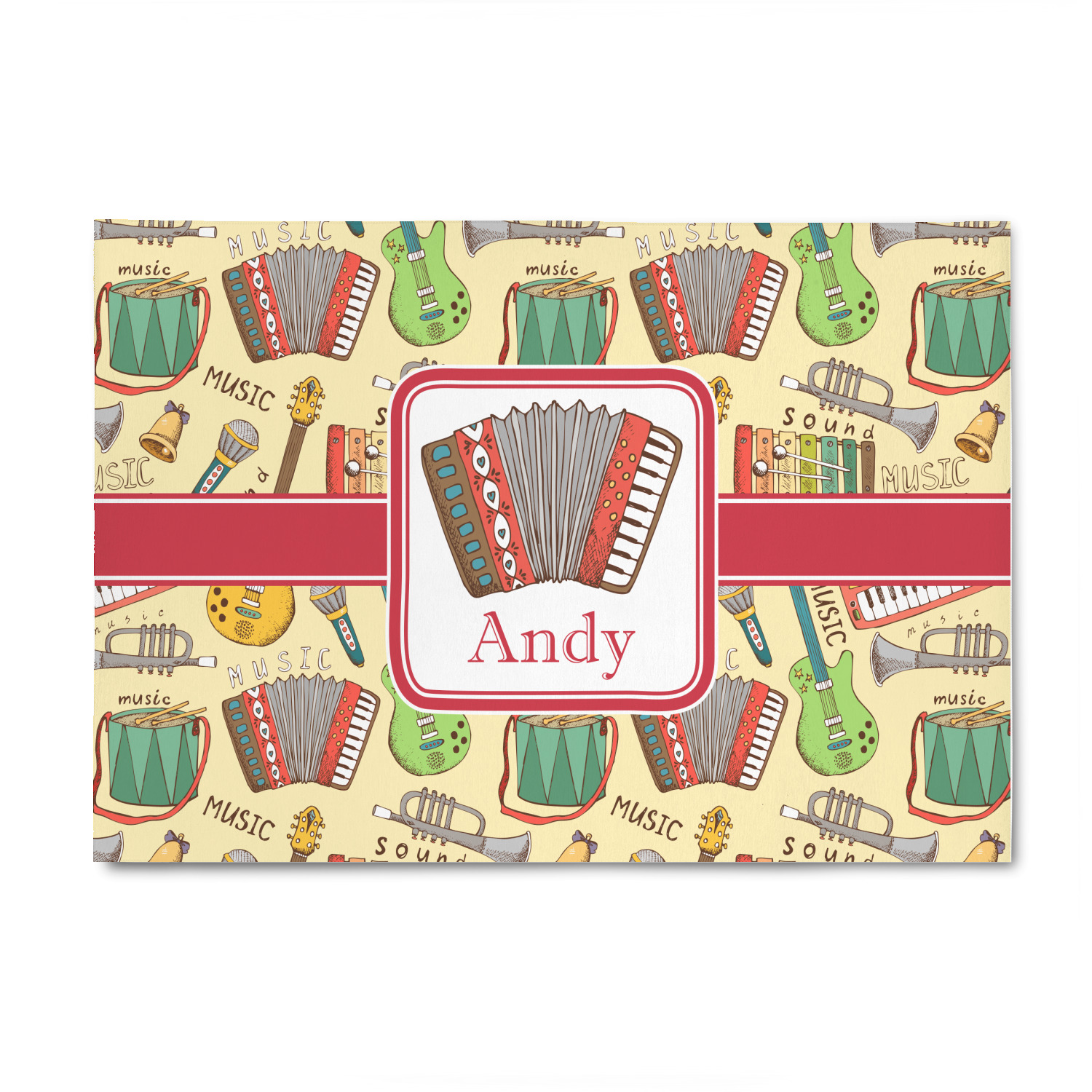 We have selected a classic red ribbon along with a square label that features the accordion along with a name for the personalization. You have a choice of instruments to feature on the label - your choices are: vintage guitar, xylophone, accordion, trumpet, keyboard, drum, microphone or bell and of course you can personalize it with your choice of text.