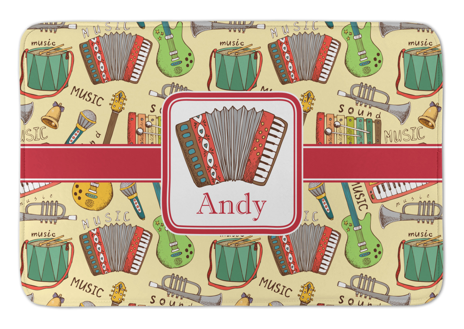 We have selected a classic red ribbon along with a square label that features the accordion along with a name for the personalization. You have a choice of instruments to feature on the label - your choices are: vintage guitar, xylophone, accordion, trumpet, keyboard, drum, microphone or bell and of course you can personalize it with your choice of text.