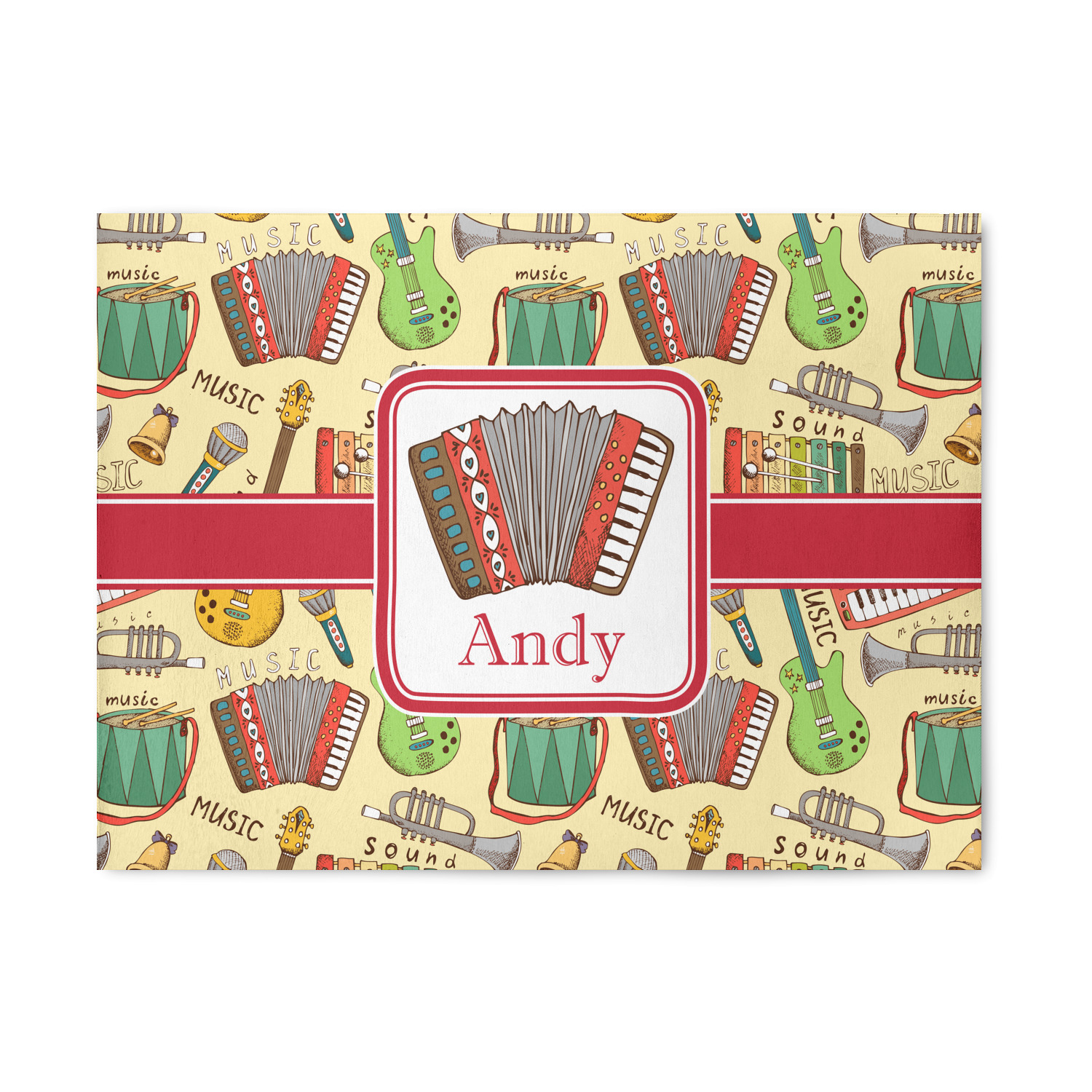 We have selected a classic red ribbon along with a square label that features the accordion along with a name for the personalization. You have a choice of instruments to feature on the label - your choices are: vintage guitar, xylophone, accordion, trumpet, keyboard, drum, microphone or bell and of course you can personalize it with your choice of text.