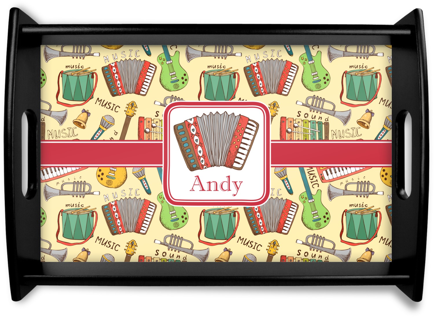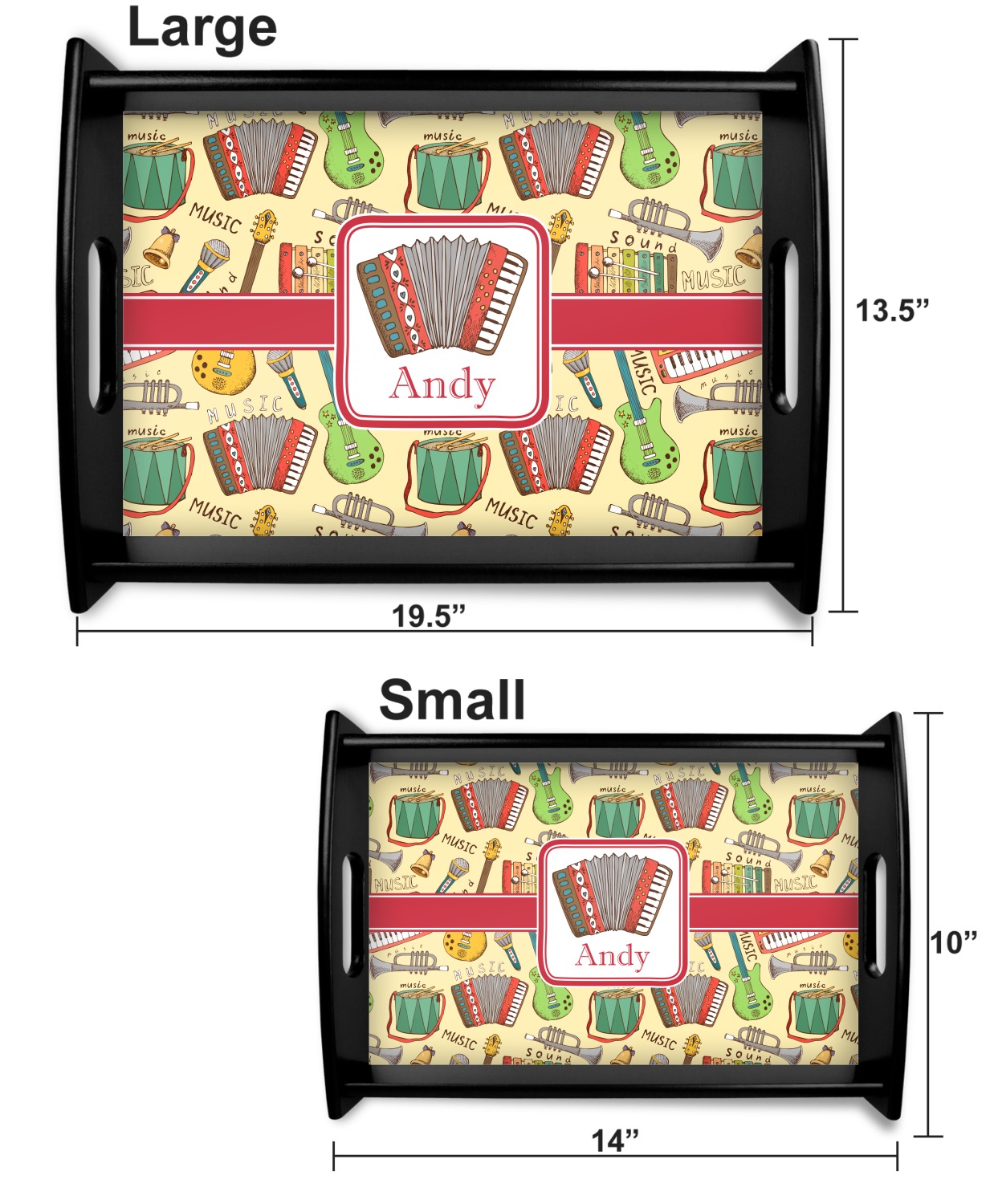This serving tray with handles features square edges and two rounded sides, creating a very modern look. Each side is fabricated from a beautifully cut, natural wood. The bottom of the interior of the tray displays your customized design in bright, vibrant color. The tray is sold in both a black color and a natural wood look. Each variation of the wood serving tray has two sizes: Small, which is 14" x 10" x 2.25", and Large, which is 19.5" x 13.5" x 2.75".