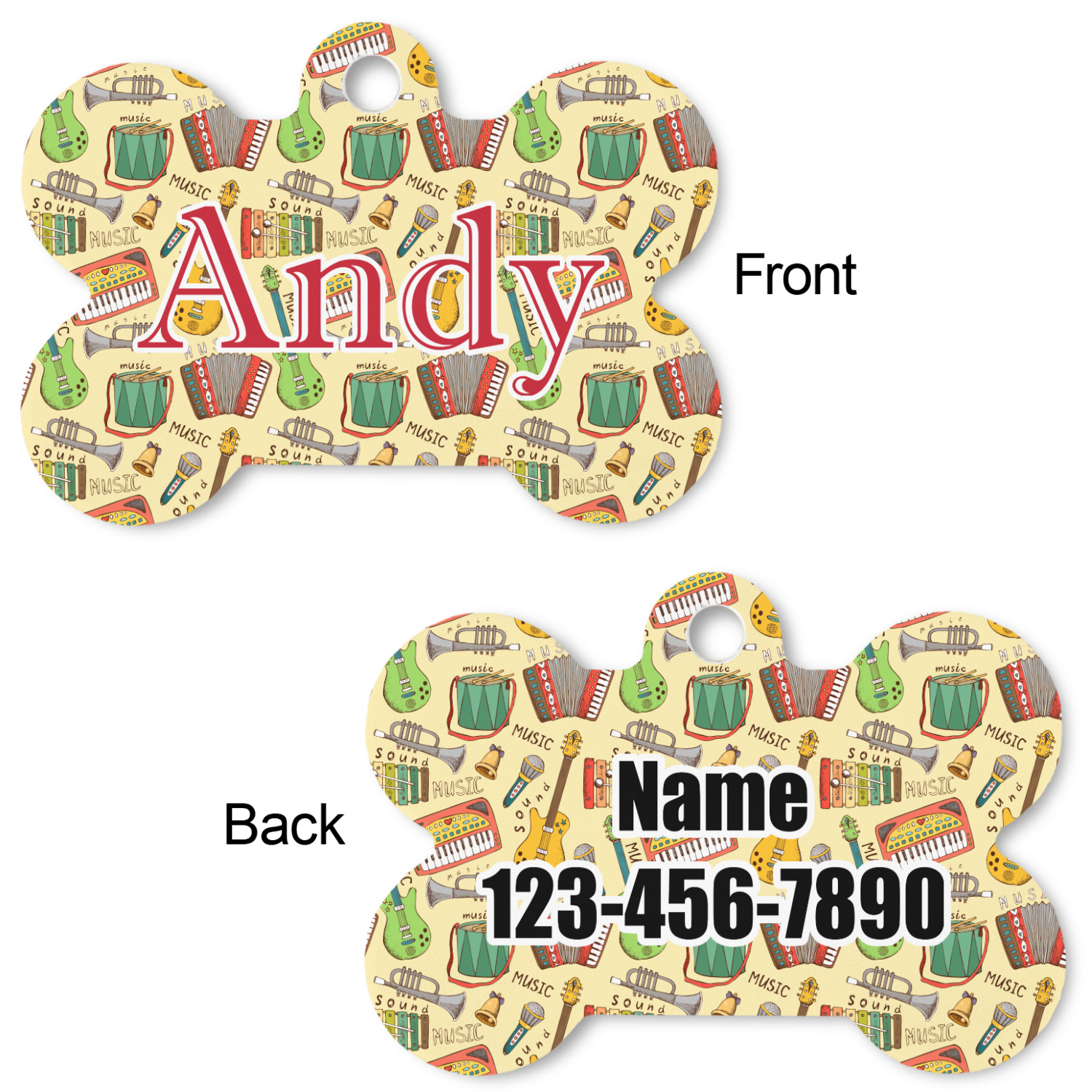 Our default design templates print your dog's personalization on the front and your contact information on the back; however everything is customizable, so you customize the patterns, the colors, the personalization, the contact information etc.