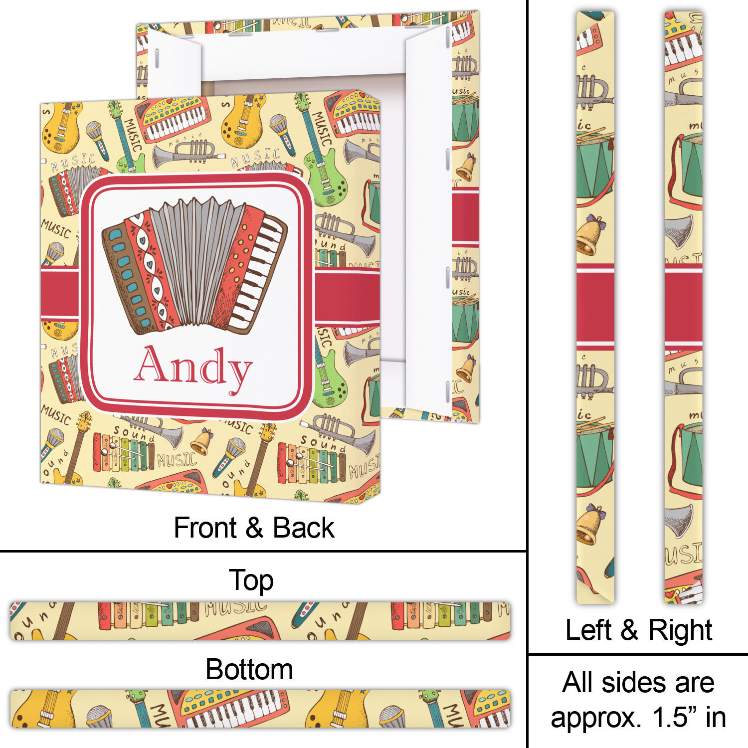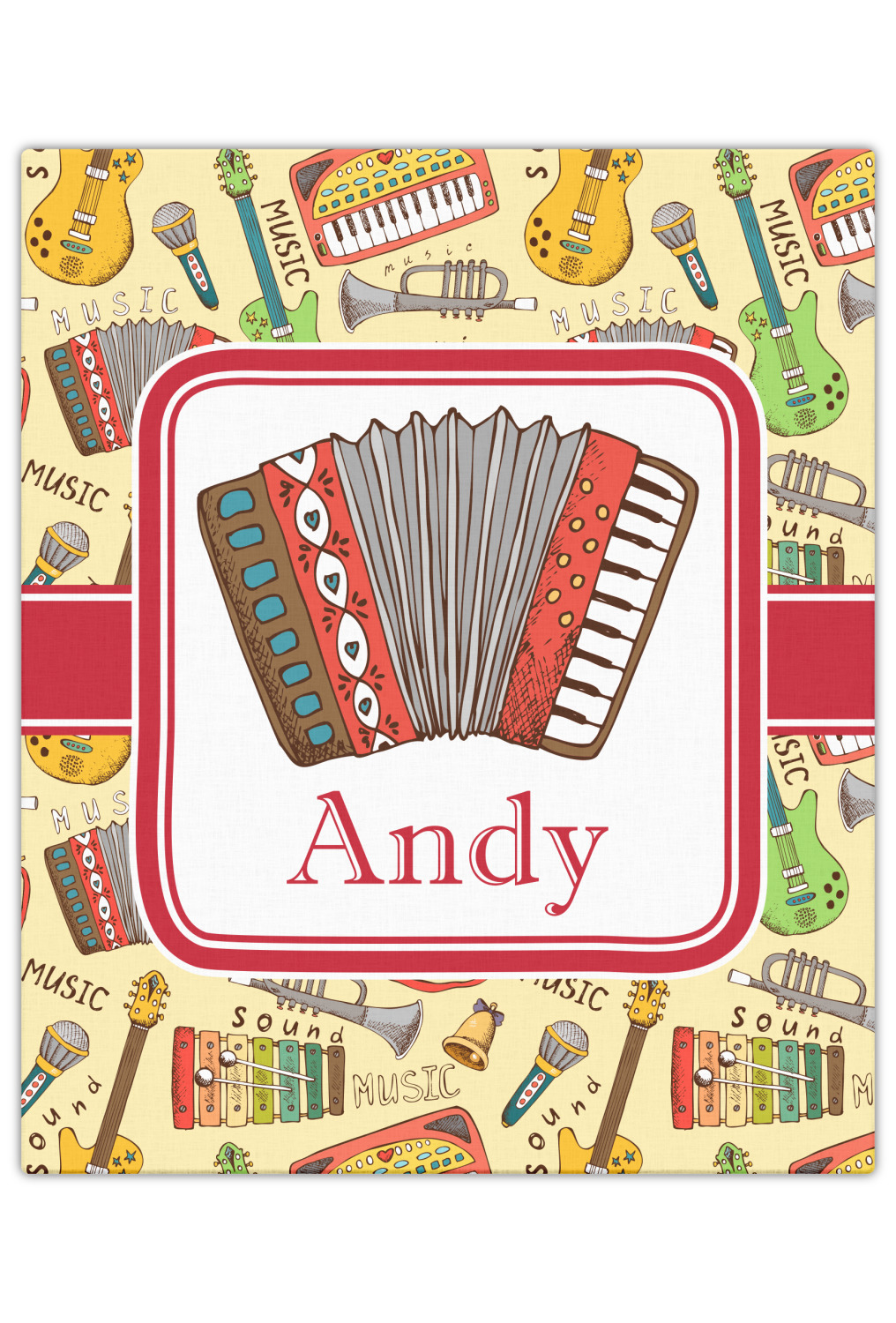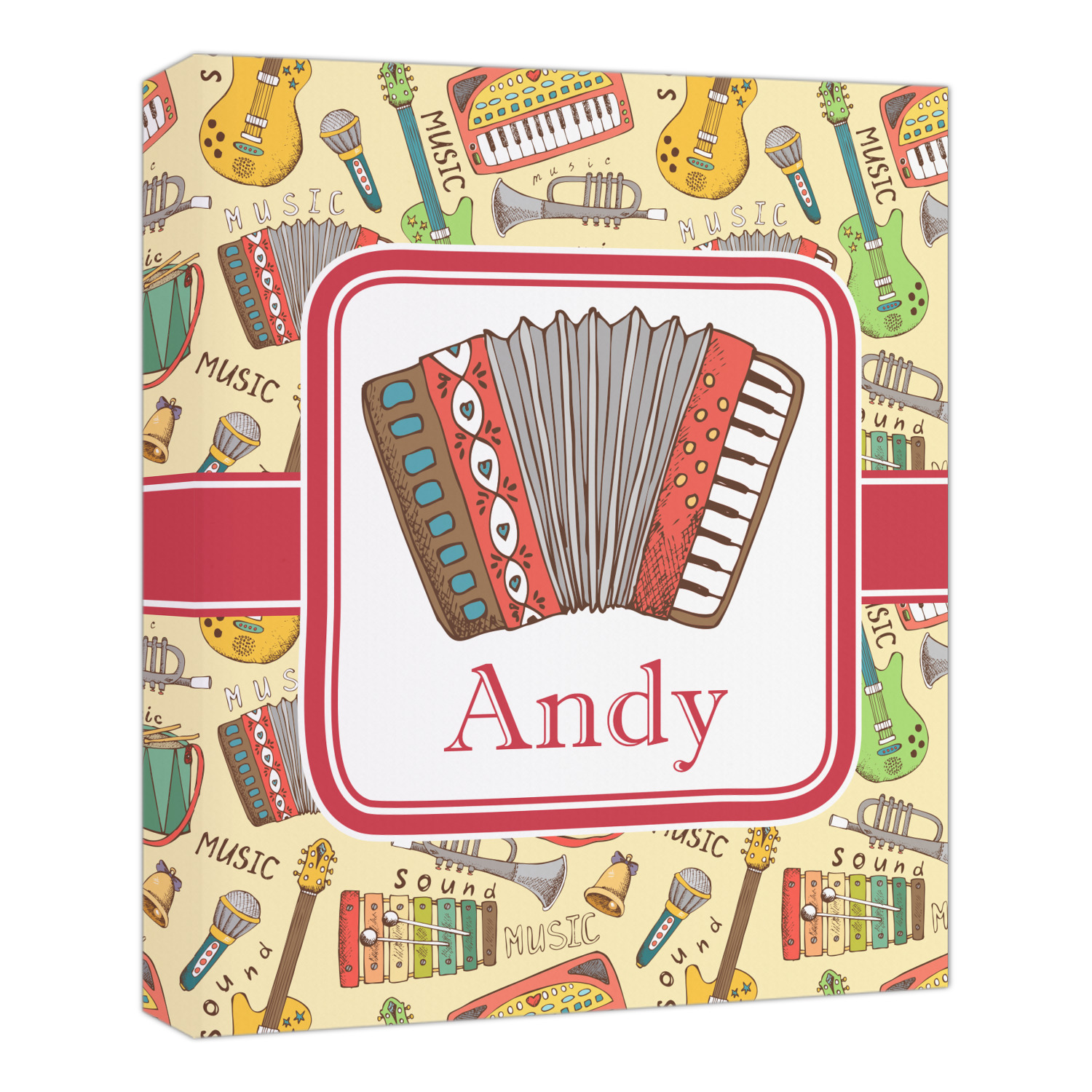 We have selected a classic red ribbon along with a square label that features the accordion along with a name for the personalization. You have a choice of instruments to feature on the label - your choices are: vintage guitar, xylophone, accordion, trumpet, keyboard, drum, microphone or bell and of course you can personalize it with your choice of text.