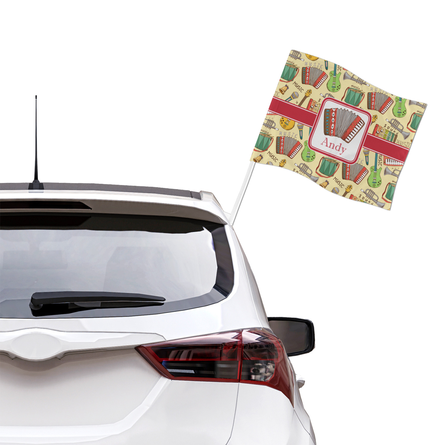 Our personalized flags are made from a durable, yet lightweight cloth that will proudly bear your logo or design of choice, while withstanding the outside elements. We have two size options - 8" x 11" and 11" x 15". Both come with a flag pole which includes a clip that secures the pole to the side window, whether it is rolled up or down. The flags are printed on both sides to display your design from all directions.
