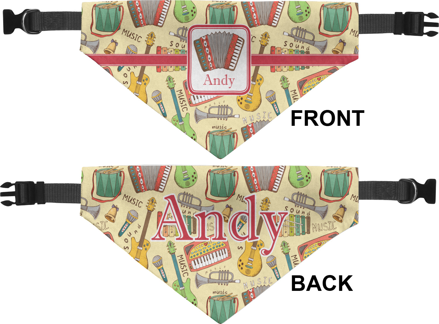 We print the front and back of these dog bandanas with your customized design. The bandana itself is made from a durable polyester, sewn together with a gap large enough to accommodate any collar. Regardless, the bandana includes a plain black, canvas collar with plastic snaps, that can easily be removed if desired. These dog bandana collars are available in four sizes: small, medium, large, and extra large. Please see our sizing chart for more information regarding the dimensions of each size.