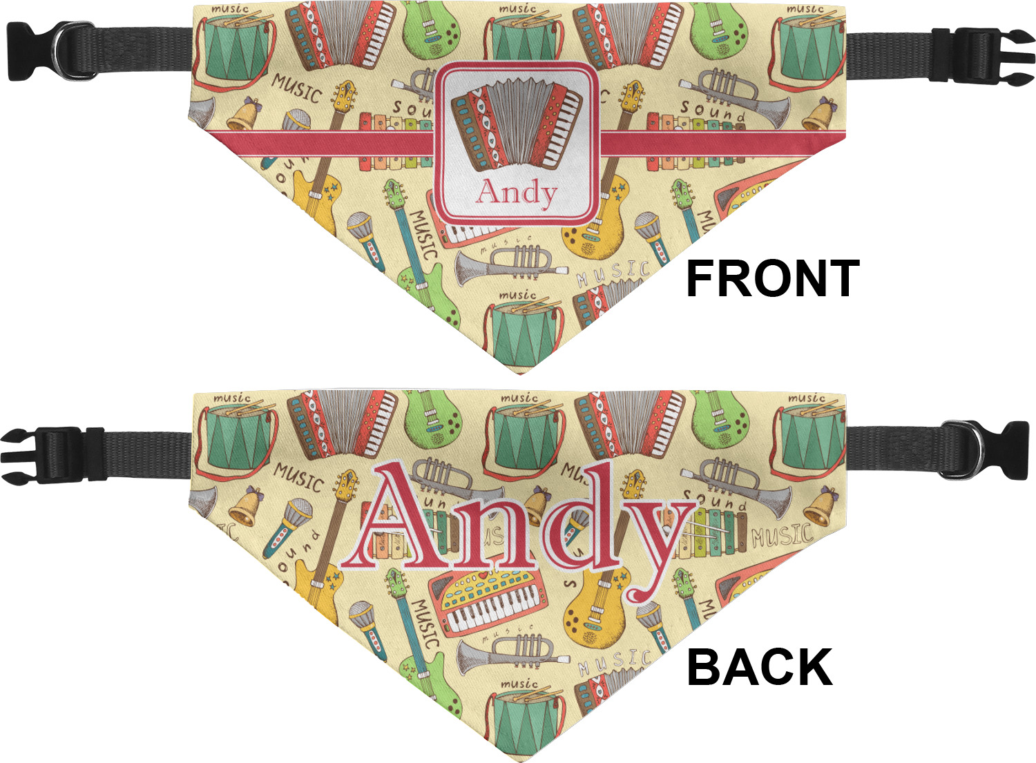 We print the front and back of these dog bandanas with your customized design. The bandana itself is made from a durable polyester, sewn together with a gap large enough to accommodate any collar. Regardless, the bandana includes a plain black, canvas collar with plastic snaps, that can easily be removed if desired. These dog bandana collars are available in four sizes: small, medium, large, and extra large. Please see our sizing chart for more information regarding the dimensions of each size.