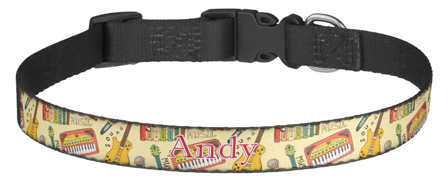 This sturdy collar, made from a durable nylon weave, will outlive your dog's episodes of excited tugging and pulling. Courtesy of its thick plastic buckle and adjuster, this collar is adjustable and accommodating of any dog. Structurally, the collar is a single piece of nylon weave that is sewn together, and features a solid metal loop where you can attach a leash or dog tag. We print and display your dog's name and pattern across the middle of the personalized dog collar.