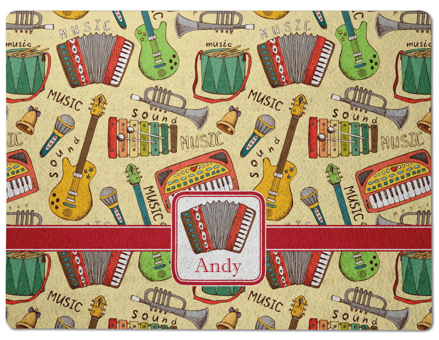 We have selected a classic red ribbon along with a square label that features the accordion along with a name for the personalization. You have a choice of instruments to feature on the label - your choices are: vintage guitar, xylophone, accordion, trumpet, keyboard, drum, microphone or bell and of course you can personalize it with your choice of text.