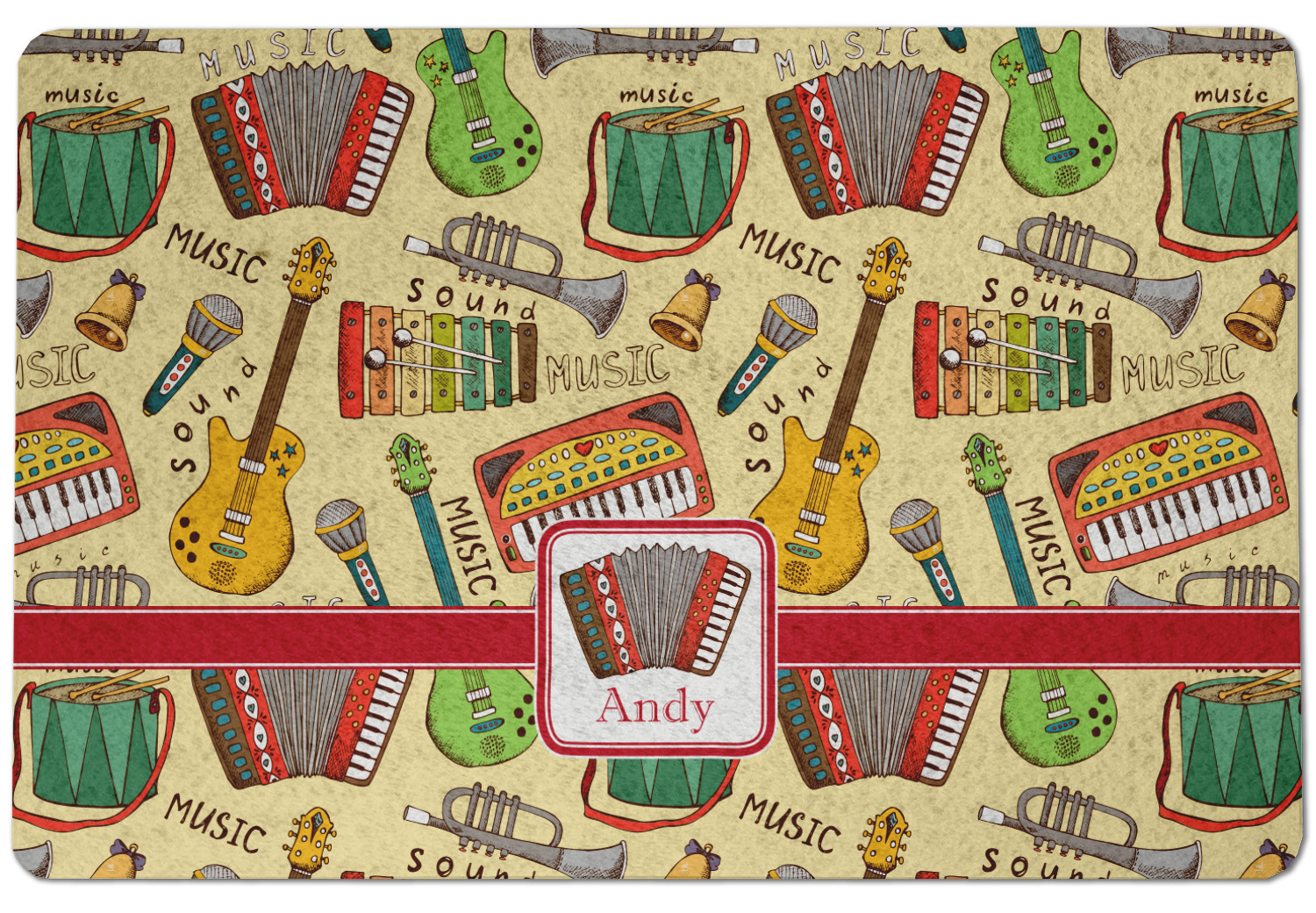 We have selected a classic red ribbon along with a square label that features the accordion along with a name for the personalization. You have a choice of instruments to feature on the label - your choices are: vintage guitar, xylophone, accordion, trumpet, keyboard, drum, microphone or bell and of course you can personalize it with your choice of text.