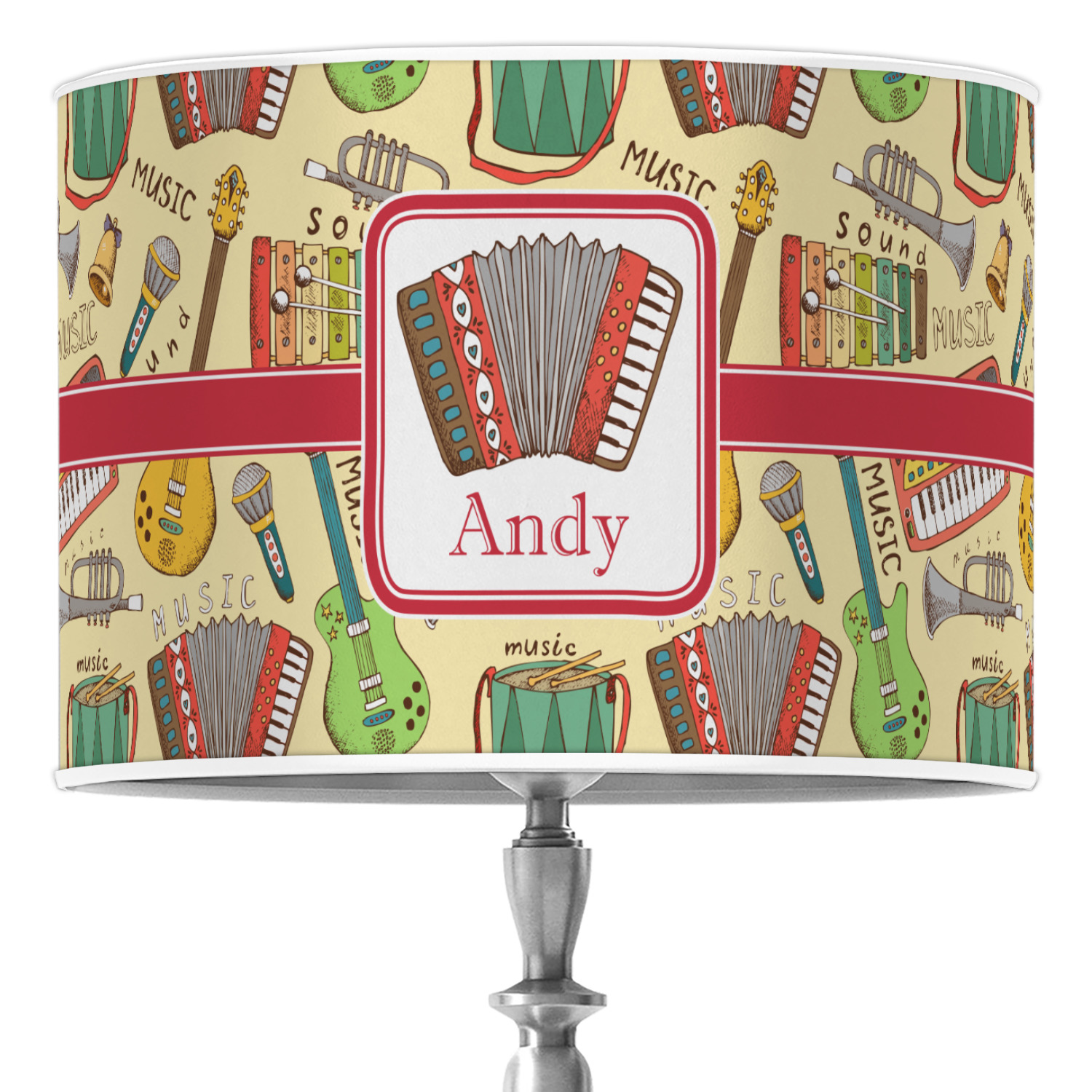 We have selected a classic red ribbon along with a square label that features the accordion along with a name for the personalization. You have a choice of instruments to feature on the label - your choices are: vintage guitar, xylophone, accordion, trumpet, keyboard, drum, microphone or bell and of course you can personalize it with your choice of text.