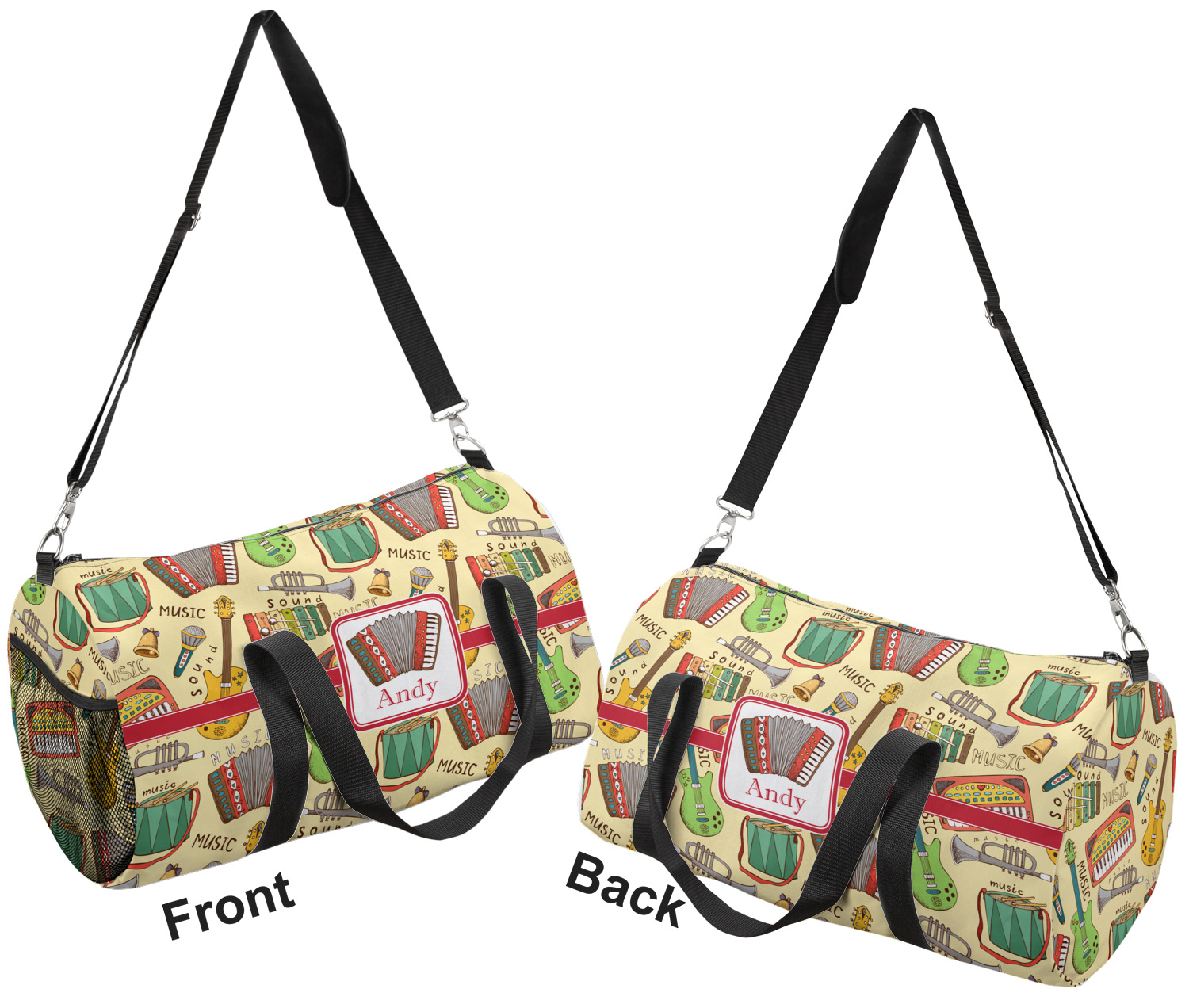 This duffle is a sturdy bag made of a canvas material. It comes in two sizes: Small (19"W x 9.5"H x 9.5"D) and Large (23"W x 12"H x 12"D). The bag is a cylindrical shape with a black adjustable strap and two handles. On one side is an elastic pouch to put a waterbottle or other small item. Your product will be sublimated with your design and is able to be designed on the front, back, and sides. Be sure to remember that the straps may cut into parts of your design if you upload your own artwork.