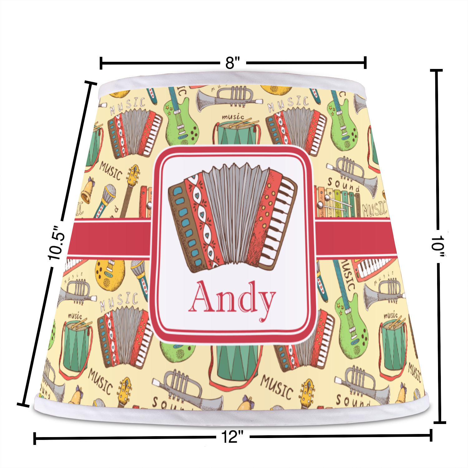 The base of this lampshade is 12 inches in diameter, and the top spans 8 inches in diameter. The total height of the lampshade is 10 inches. The angled nature of this custom lampshade concentrates the light, making it ideal for smaller spaces. This lampshade is made of matte, polyfilm, and displays your customization in its middle. The top and bottom of this colorful lamp shade are lined with a white fabric ribbon (which can be replaced with black inside the design studio) which frames your design and creates a sophisticated finish. As an UNO fitter lampshade, this unique lamp shade will fit a variety of bases.