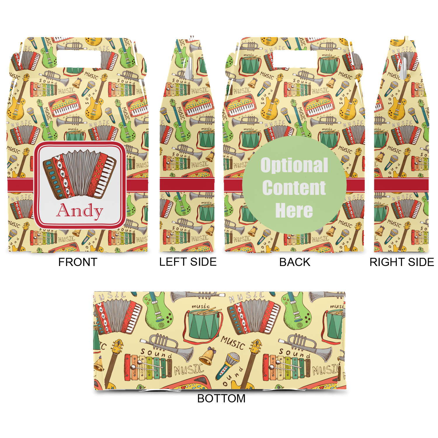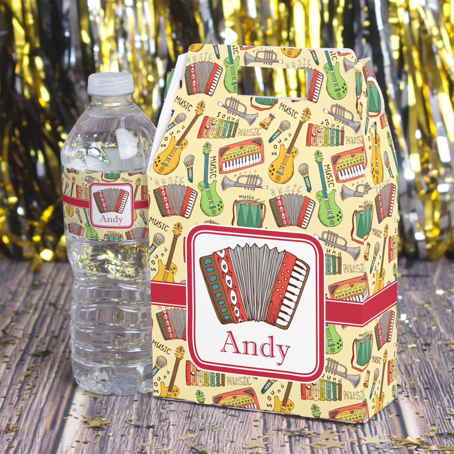 We have selected a classic red ribbon along with a square label that features the accordion along with a name for the personalization. You have a choice of instruments to feature on the label - your choices are: vintage guitar, xylophone, accordion, trumpet, keyboard, drum, microphone or bell and of course you can personalize it with your choice of text.