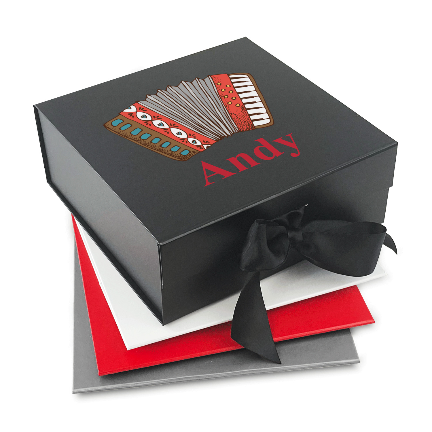 We have selected a classic red ribbon along with a square label that features the accordion along with a name for the personalization. You have a choice of instruments to feature on the label - your choices are: vintage guitar, xylophone, accordion, trumpet, keyboard, drum, microphone or bell and of course you can personalize it with your choice of text.