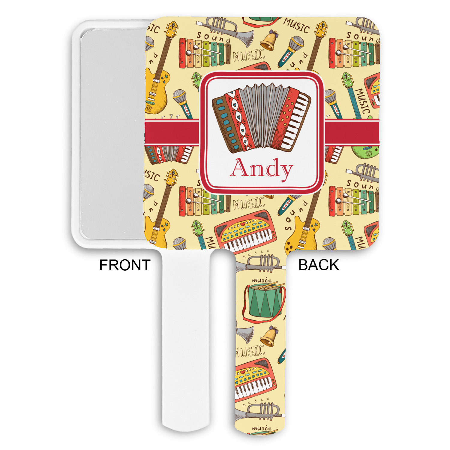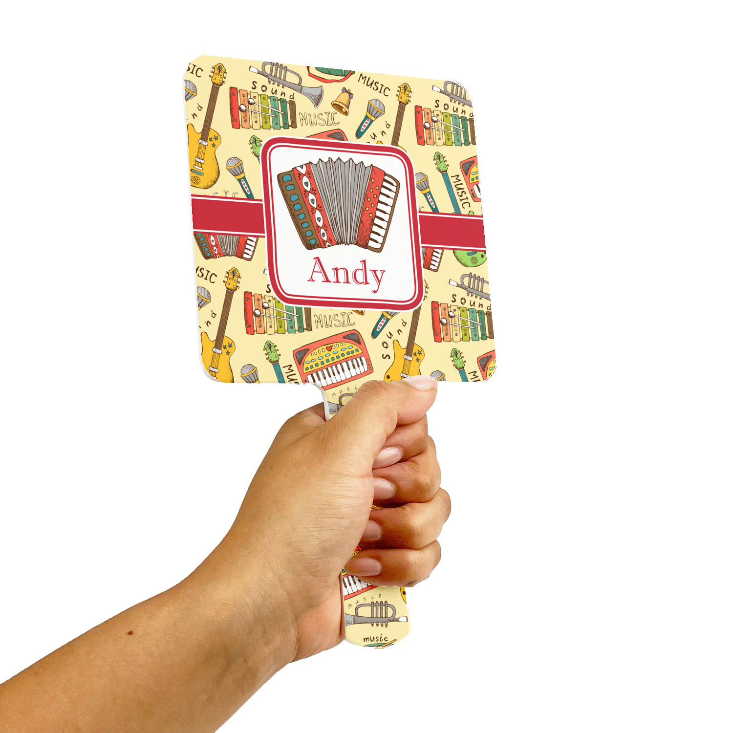 We have selected a classic red ribbon along with a square label that features the accordion along with a name for the personalization. You have a choice of instruments to feature on the label - your choices are: vintage guitar, xylophone, accordion, trumpet, keyboard, drum, microphone or bell and of course you can personalize it with your choice of text.