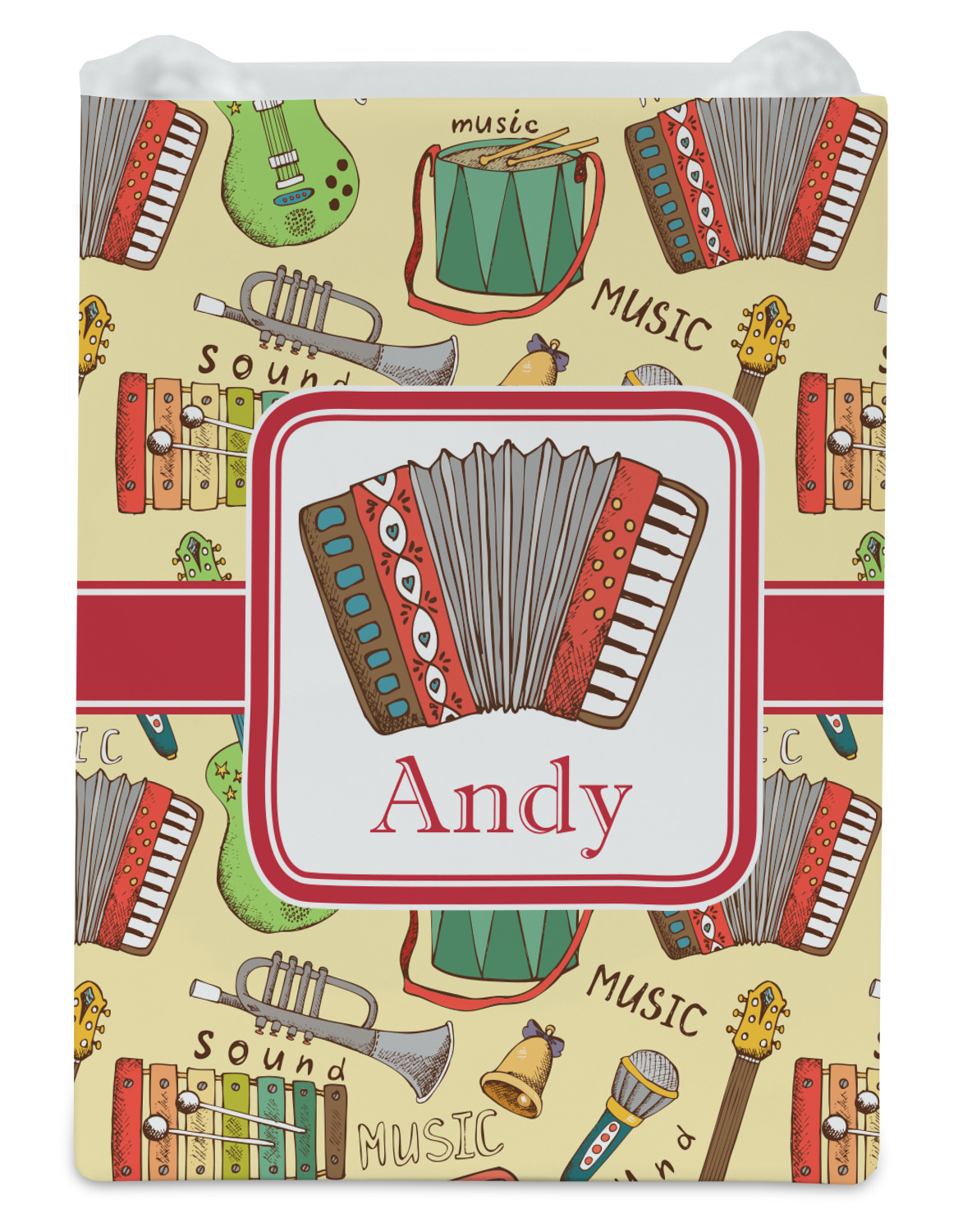 We have selected a classic red ribbon along with a square label that features the accordion along with a name for the personalization. You have a choice of instruments to feature on the label - your choices are: vintage guitar, xylophone, accordion, trumpet, keyboard, drum, microphone or bell and of course you can personalize it with your choice of text.