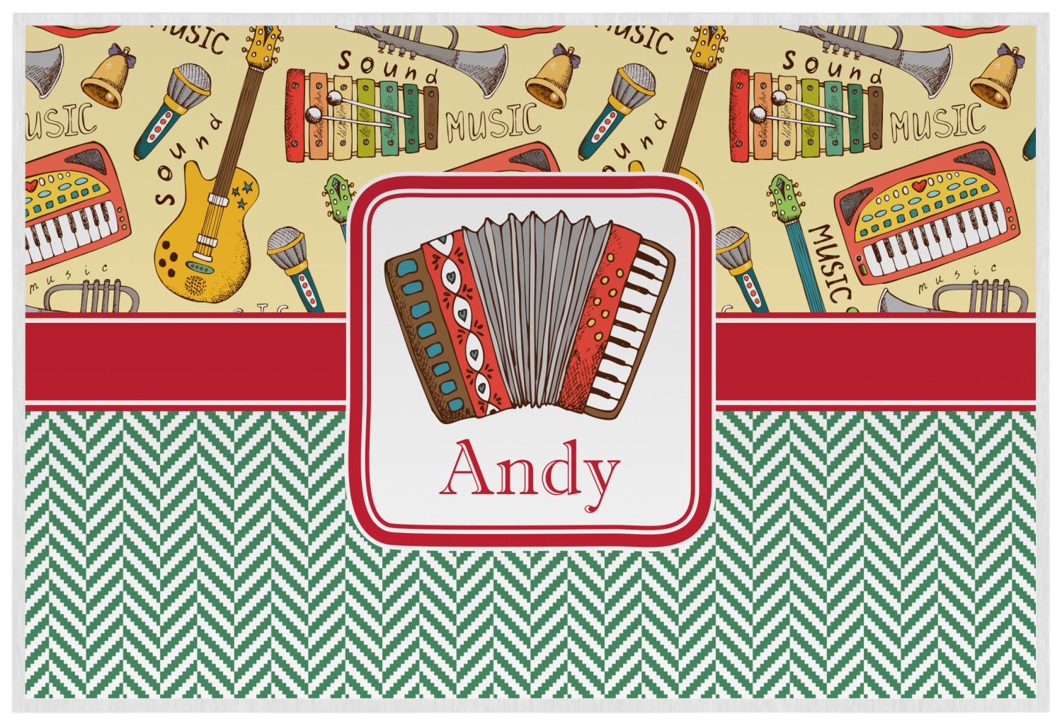 We have selected a classic red ribbon along with a square label that features the accordion along with a name for the personalization. You have a choice of instruments to feature on the label - your choices are: vintage guitar, xylophone, accordion, trumpet, keyboard, drum, microphone or bell and of course you can personalize it with your choice of text.