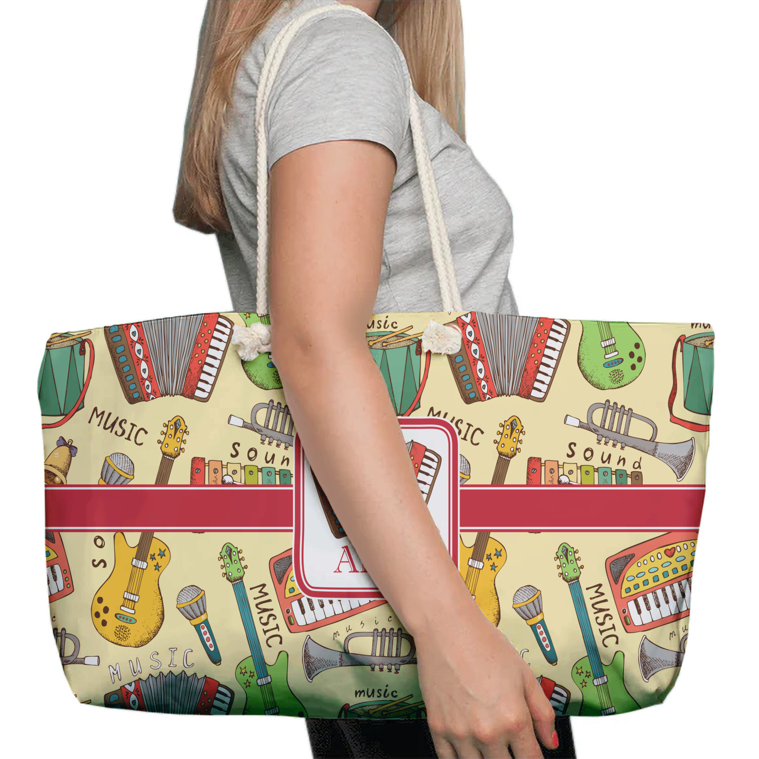 These large totes are handmade i.e. printed, cut and sewn right here in the USA. The canvas like material is printed using dye sublimation; the fabric is then cut and sewn along with a beautiful cream colored lining (to match the rope handles). The brass grommets are then added and the cream colored rope if fed through the grommets and knotted.