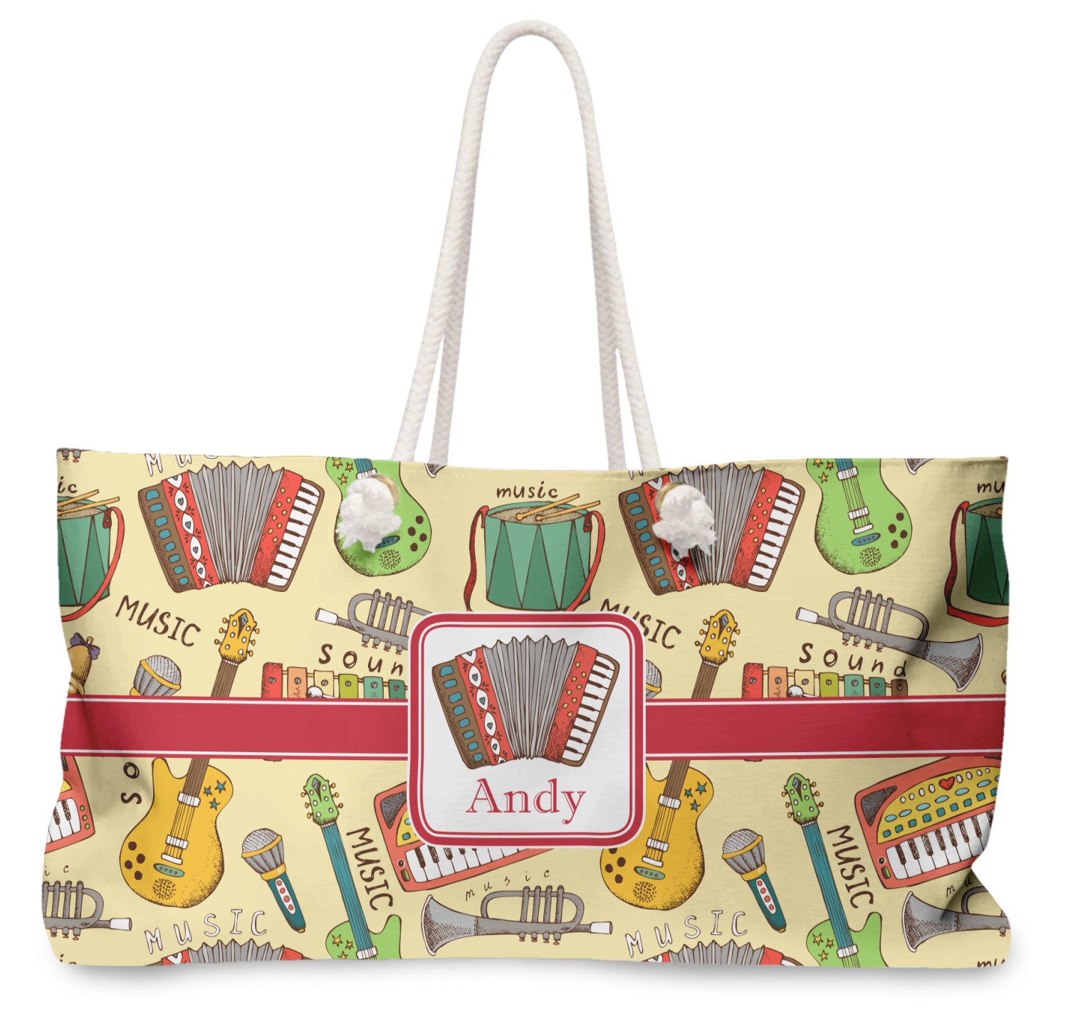 Our oversized weekender tote with rope handles is perfect for your weekend at the beach or on the town. This large tote are 24" W X 13" H, with a 5" gusset and a 27" thick rope handles with a knot that is put through a grommeted brass hole.