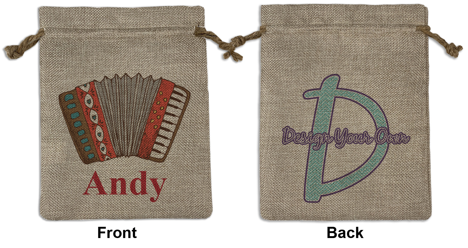 We sell our Burlap Gift Bags in 3 variant sized bags. Made with burlap polyester, each personalized bag can be secured with a twine drawstring pull. Your custom design is available to print on one side or both sides - completely up to you! The sizes of the bags measure approximately 4.5" x 6.5" for the smallest size, 6.5" x 8.0" for the medium size, and 6.5" x 13.5" for the large-sized bag.