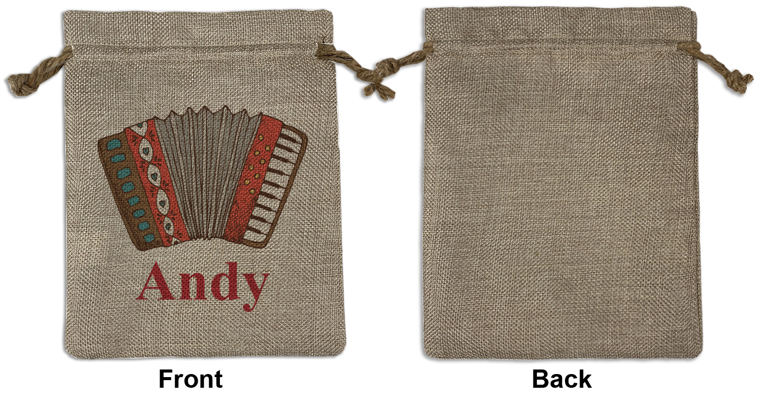 We sell our Burlap Gift Bags in 3 variant sized bags. Made with burlap polyester, each personalized bag can be secured with a twine drawstring pull. Your custom design is available to print on one side or both sides - completely up to you! The sizes of the bags measure approximately 4.5" x 6.5" for the smallest size, 6.5" x 8.0" for the medium size, and 6.5" x 13.5" for the large-sized bag.