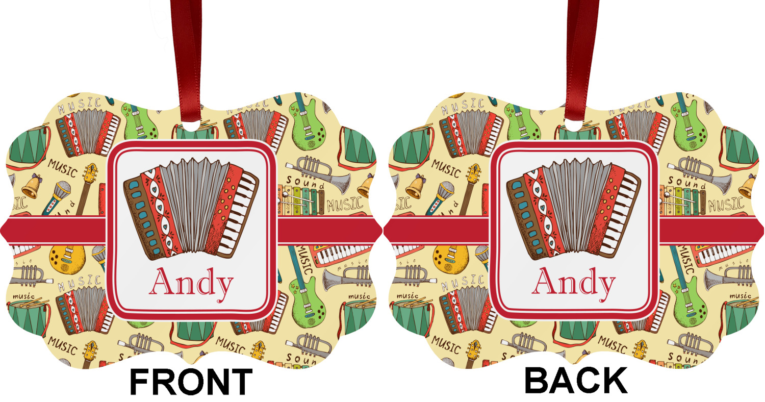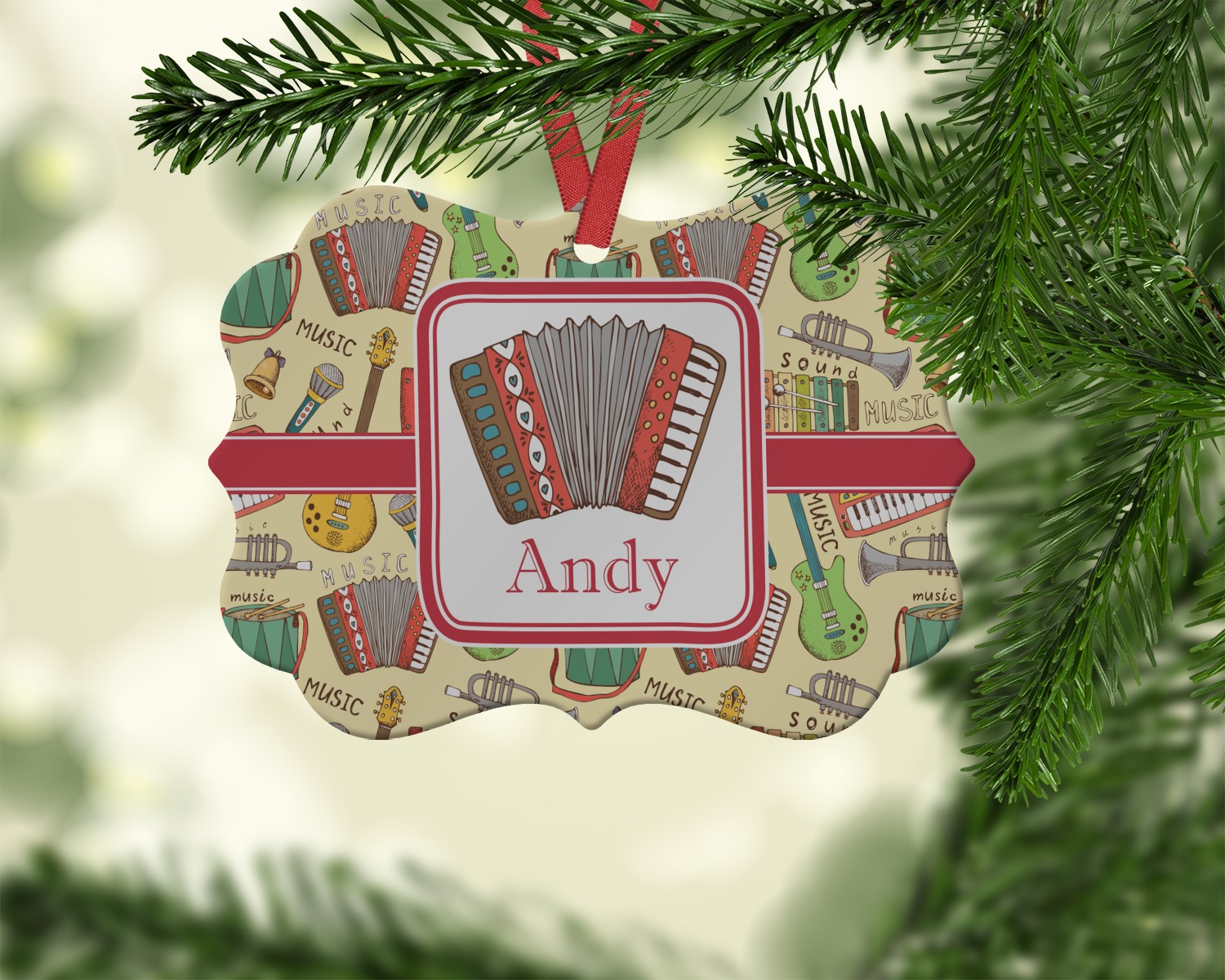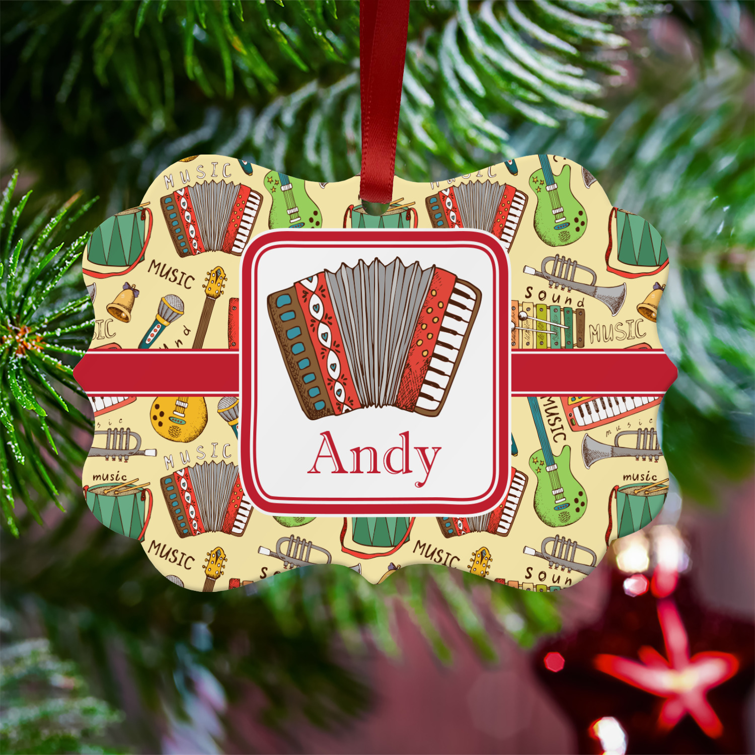 We have selected a classic red ribbon along with a square label that features the accordion along with a name for the personalization. You have a choice of instruments to feature on the label - your choices are: vintage guitar, xylophone, accordion, trumpet, keyboard, drum, microphone or bell and of course you can personalize it with your choice of text.