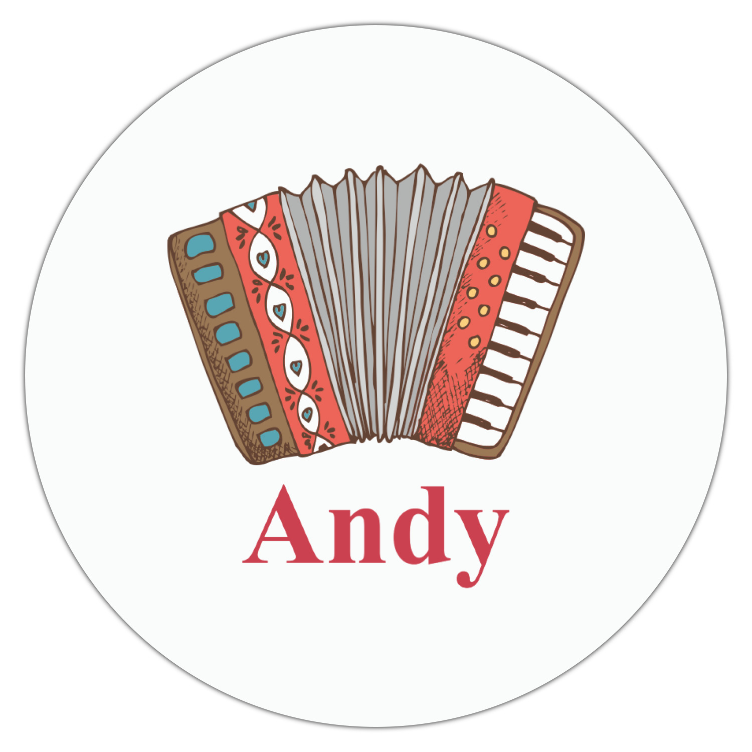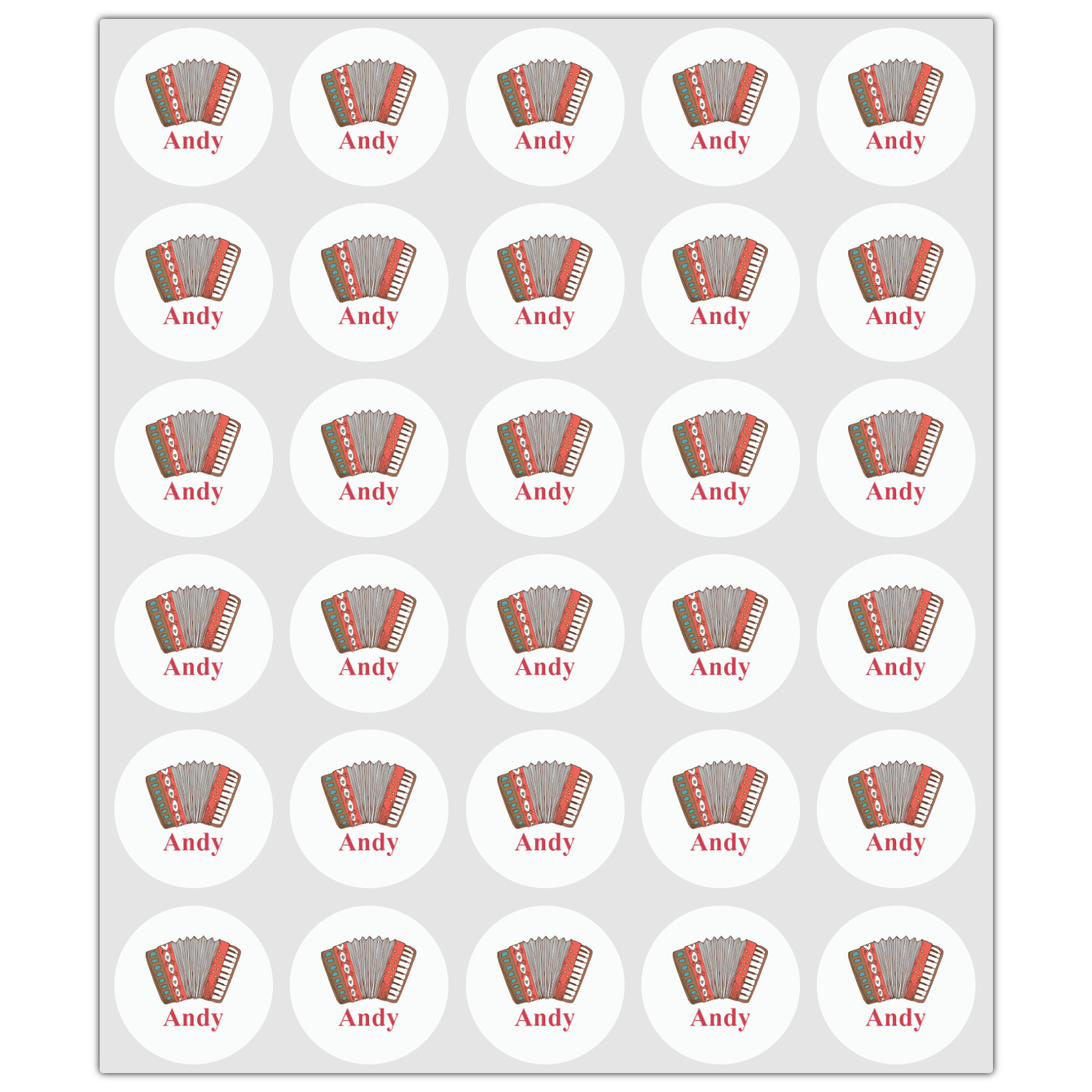 We have selected a classic red ribbon along with a square label that features the accordion along with a name for the personalization. You have a choice of instruments to feature on the label - your choices are: vintage guitar, xylophone, accordion, trumpet, keyboard, drum, microphone or bell and of course you can personalize it with your choice of text.