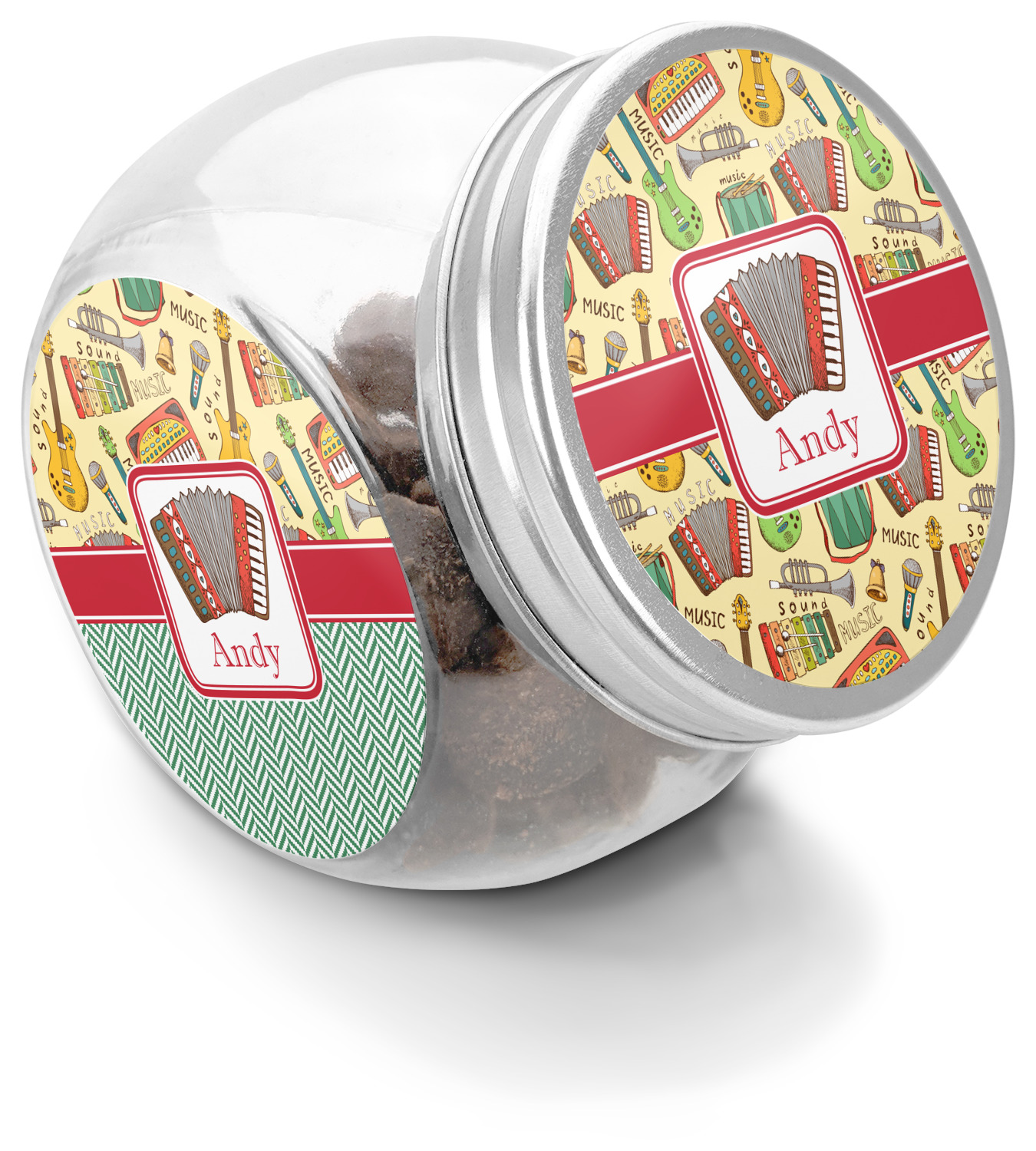 This treat jar is an excellent way to store treats for your favorite canine or feline. Moreover, their delicate, classy appearance makes them a tasteful addition to your countertop's décor. Crafted from clear glass, its unique construction and silver metal, screw-on lid allows for quick and easy access. Three, permanent, vinyl stickers are applied to both sides of the jar and lid, presenting your personalized design. The base of this glass, dog treat jar is 3.4" x 4.75", and the jar stands at 5" tall. Though on the smaller side, this jar is best suited for smaller treats or training treats.