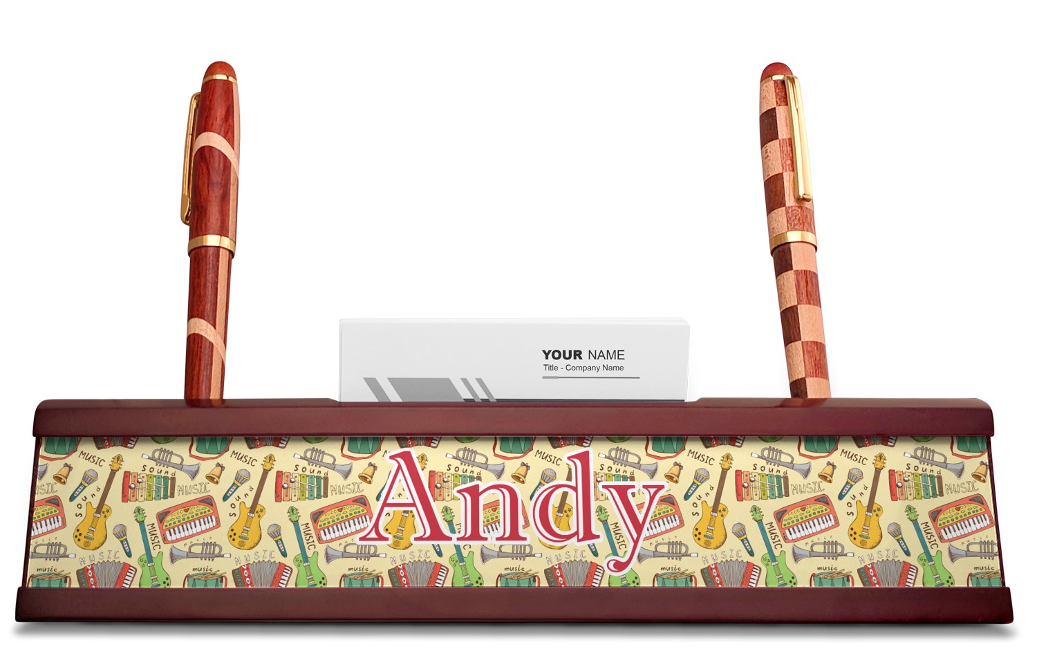Your desk name plates are crafted from a high-quality, dark-cherry mahogany. At approximately 9.5 by 1.875 by 2.5 inches, this name plaque will fit perfectly, front and center, on your desk. Your customization spans across the entire face of the nameplate. Behind the nameplate lies a skinny slot that can fit approximately 15, traditionally-sized, business cards. You can also store your writing utensils on either side of this custom desk name plate.