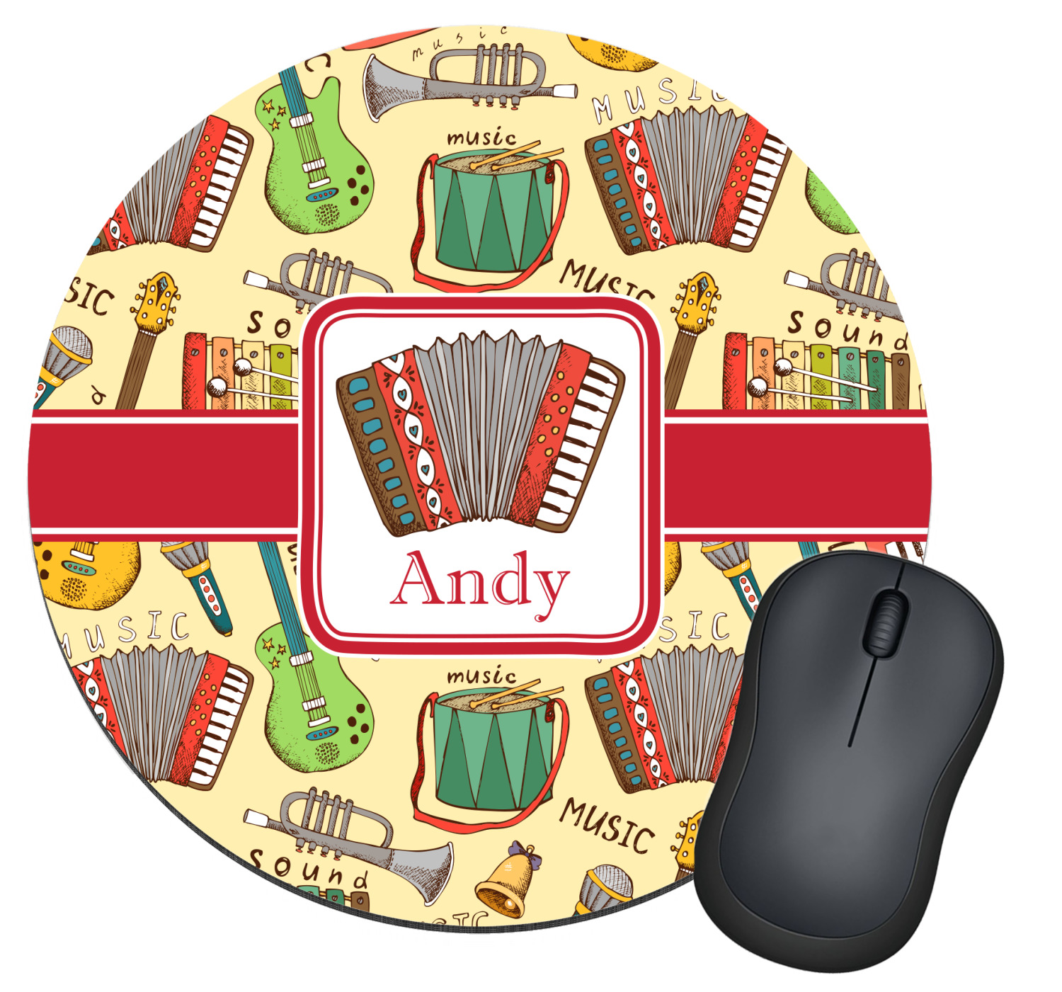 We have selected a classic red ribbon along with a square label that features the accordion along with a name for the personalization. You have a choice of instruments to feature on the label - your choices are: vintage guitar, xylophone, accordion, trumpet, keyboard, drum, microphone or bell and of course you can personalize it with your choice of text.