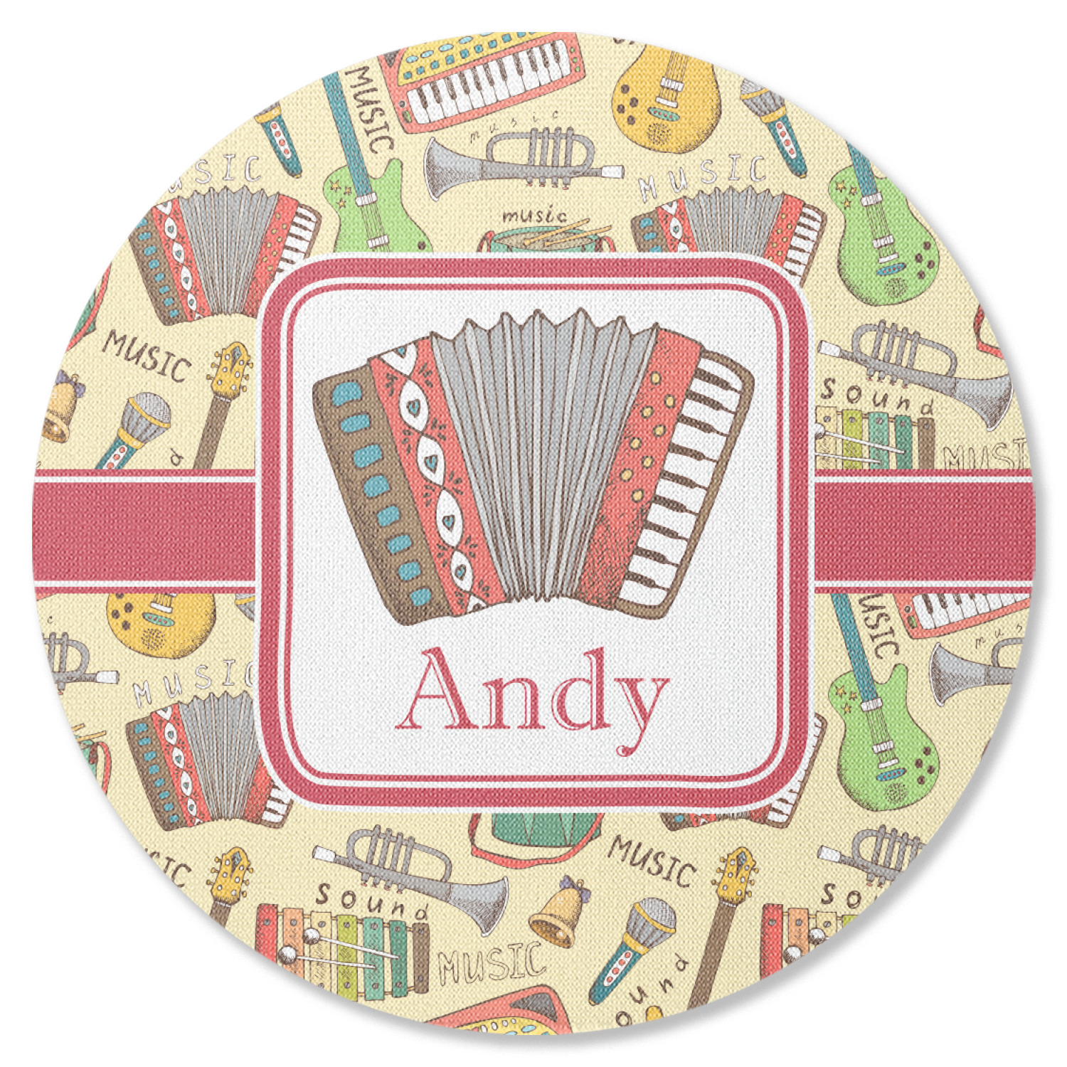 We have selected a classic red ribbon along with a square label that features the accordion along with a name for the personalization. You have a choice of instruments to feature on the label - your choices are: vintage guitar, xylophone, accordion, trumpet, keyboard, drum, microphone or bell and of course you can personalize it with your choice of text.