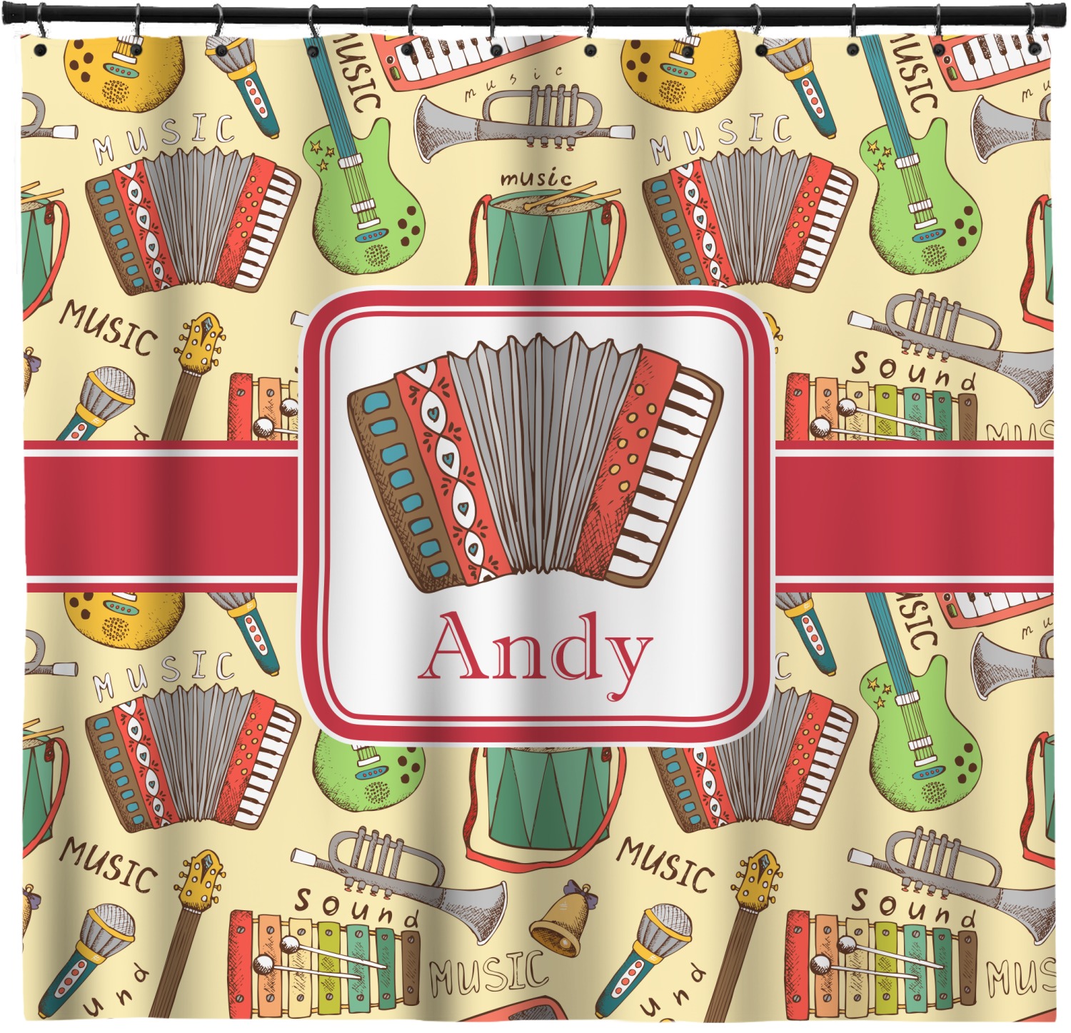 We have selected a classic red ribbon along with a square label that features the accordion along with a name for the personalization. You have a choice of instruments to feature on the label - your choices are: vintage guitar, xylophone, accordion, trumpet, keyboard, drum, microphone or bell and of course you can personalize it with your choice of text.