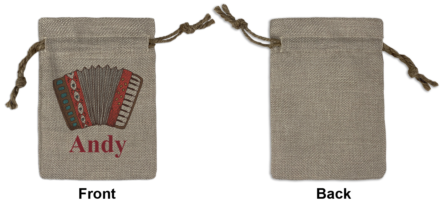 We sell our Burlap Gift Bags in 3 variant sized bags. Made with burlap polyester, each personalized bag can be secured with a twine drawstring pull. Your custom design is available to print on one side or both sides - completely up to you! The sizes of the bags measure approximately 4.5" x 6.5" for the smallest size, 6.5" x 8.0" for the medium size, and 6.5" x 13.5" for the large-sized bag.