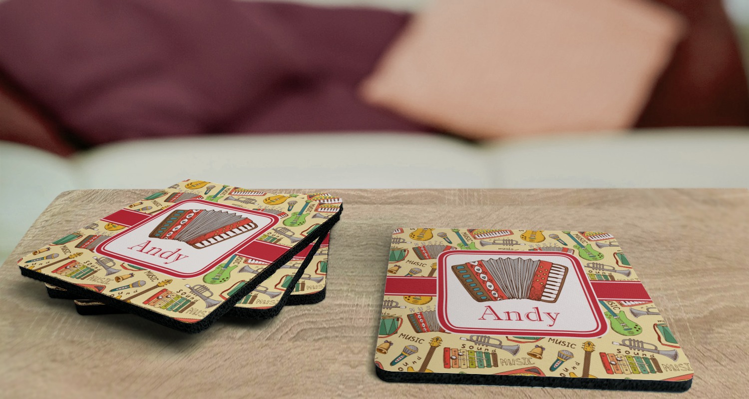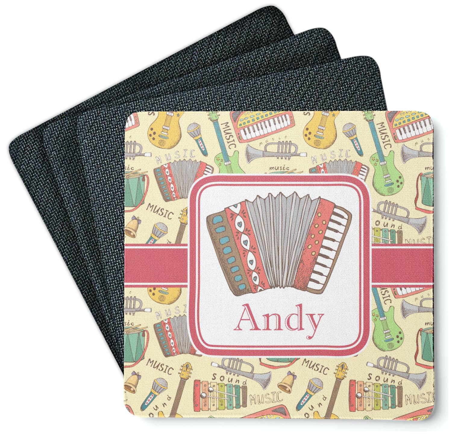 These drink coasters have a smooth, polyester top and a textured, rubber backing on its bottom. The non-slip rubber backing underneath works to keep any spills at bay. At 4 by 4 by 0.25 inches thick, these custom coasters are a suitable size for most drinkware. Your personalization is displayed atop the face of the cup coaster. We sell these rubber coasters in two different shapes: square and round. You can buy each shape as singulars or as a set of 4.