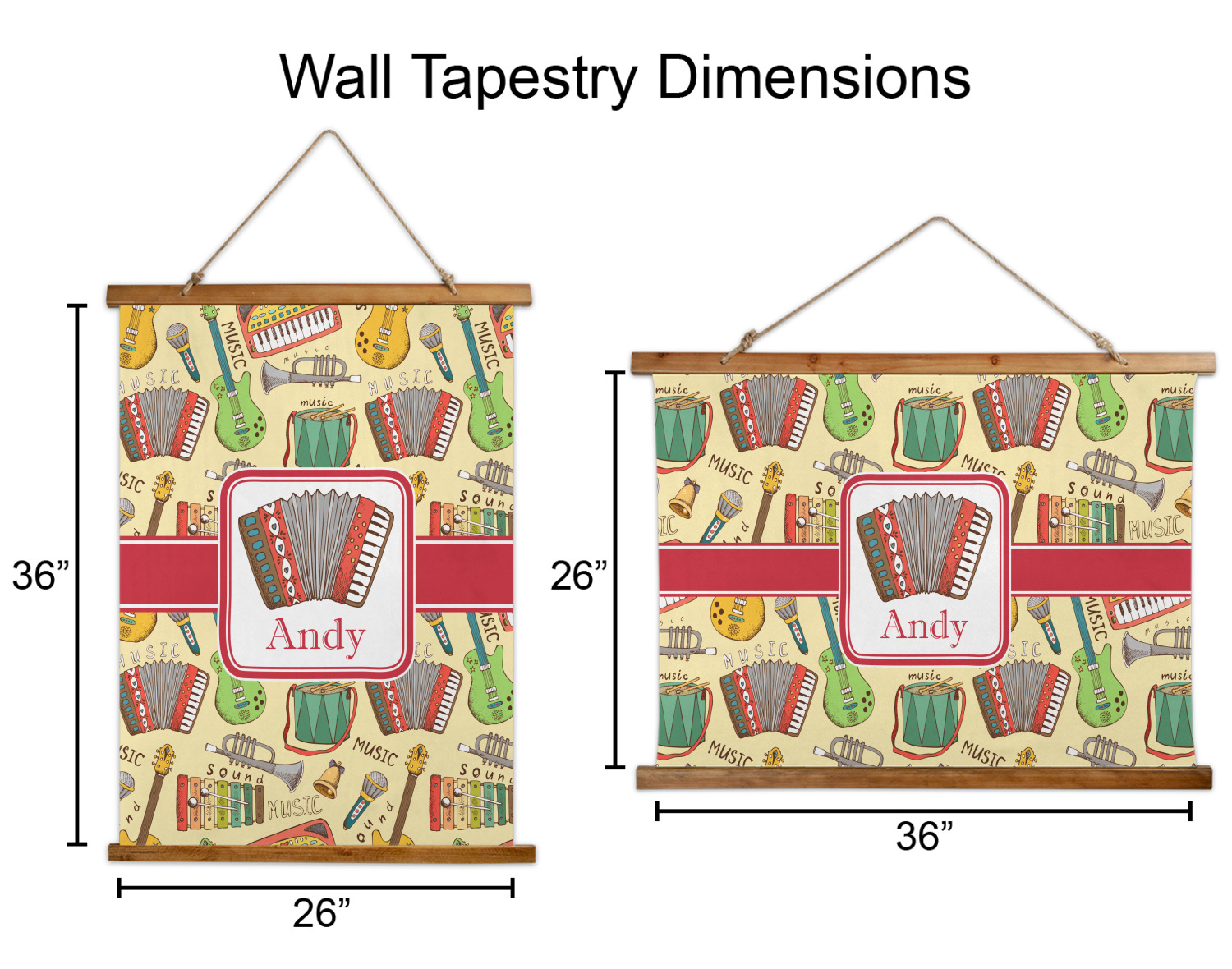 Made in two different orientations - portrait or landscape - both are 26" x 36". Your design is printed on a high quality polyester fabric with hemmed edges. The wood on the top and bottom of the tapestry is 1.25" tall and 0.25" thick and there are two pieces on top and bottom which sandwich the fabric.