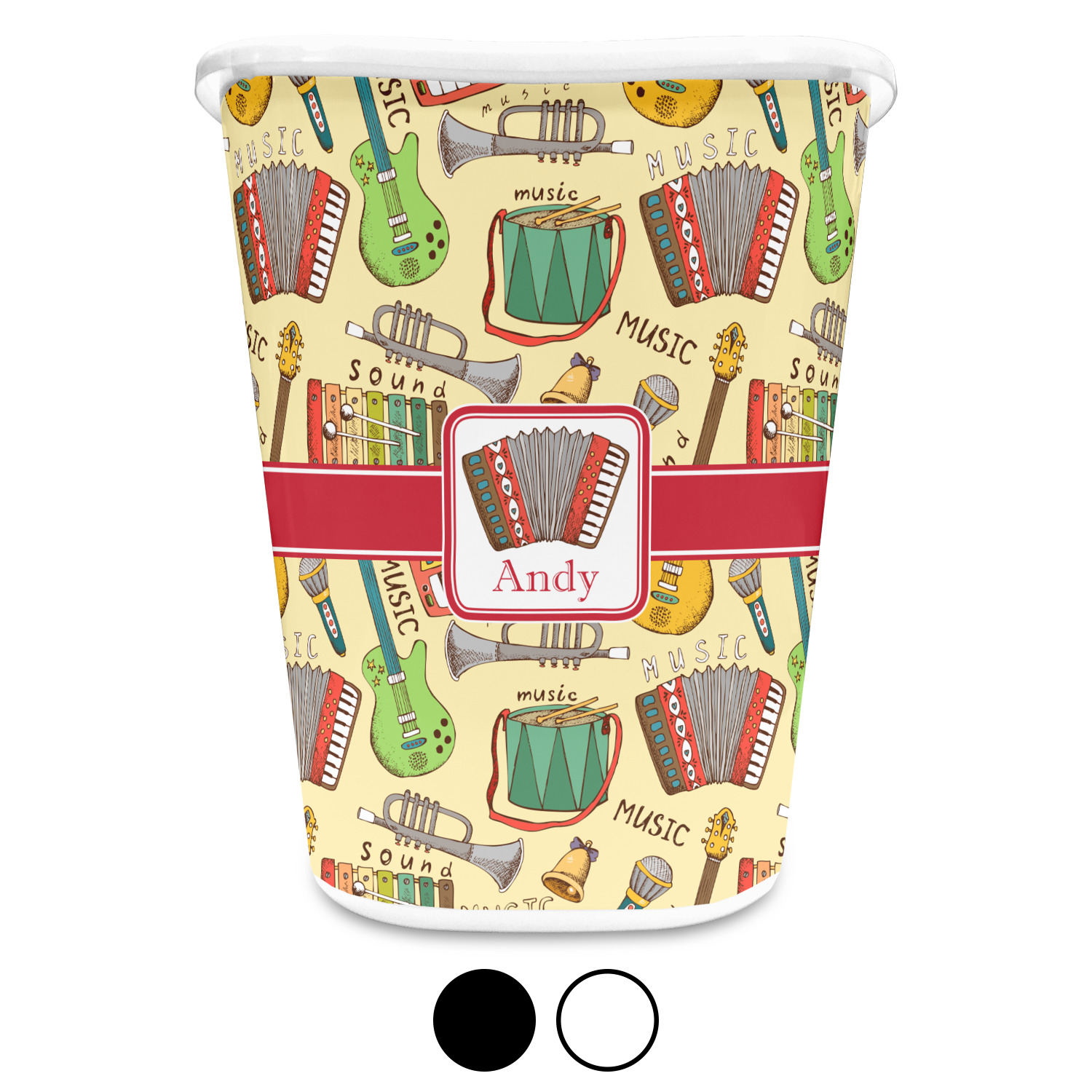 You can choose to purchase these decorative wastebaskets in either a white or a black color that will show on the base and the upper rim. Your customization is printed on a high-gloss, fine-quality vinyl adhesive, and you can choose to either have this adhesive applied to one side only or to both sides. As such, this plastic wastebasket can be single-sided or double-sided, depending on your creative vision. Your customization is printed using durable inks, making the design waterproof and resistant to fading over time.