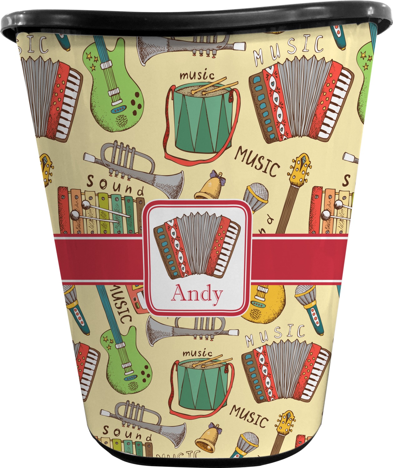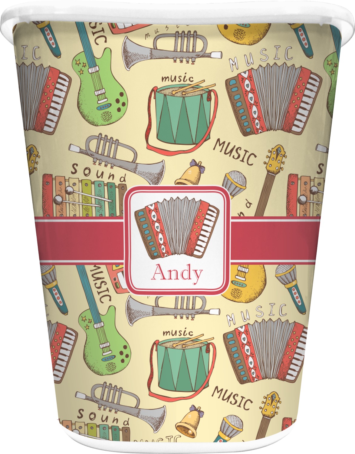 We have selected a classic red ribbon along with a square label that features the accordion along with a name for the personalization. You have a choice of instruments to feature on the label - your choices are: vintage guitar, xylophone, accordion, trumpet, keyboard, drum, microphone or bell and of course you can personalize it with your choice of text.