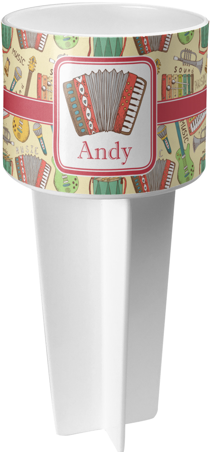 This cup holder has a large stake at its bottom that anchors it to the sand or ground below, while the cup holder rests above the stake. The entire drink holder is made of durable plastic and displays your customization around the cup holder portion. We sell these personalized beach spikers in two different colors: black and white.